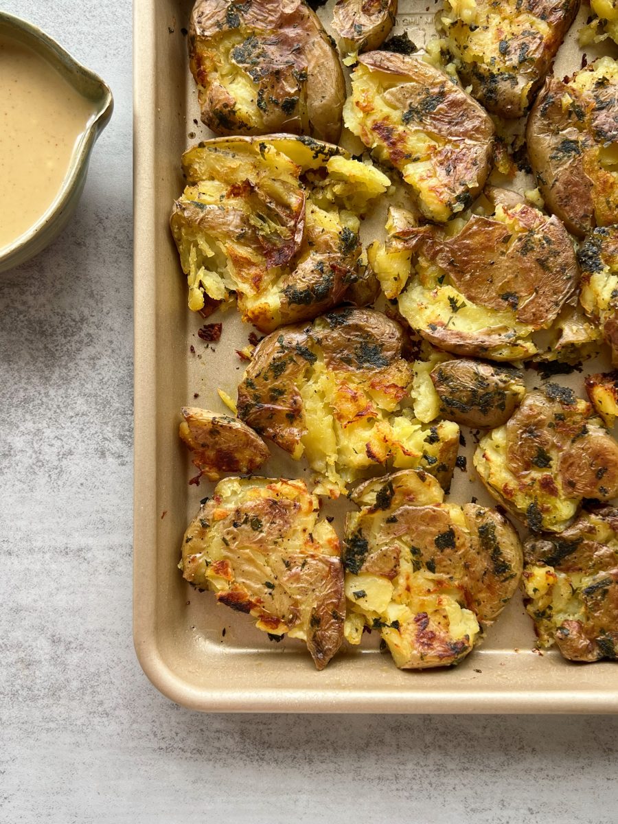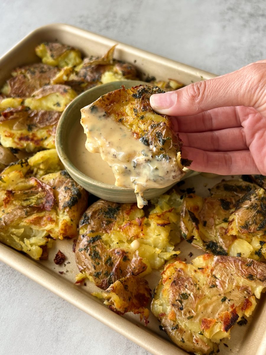 Smashed potatoes have always been one of my favorite side dishes. They’re easy to make and taste delicious with a homemade dipping sauce. These golden baby potatoes are tossed in olive oil, herbs and salt & pepper then baked until crispy.