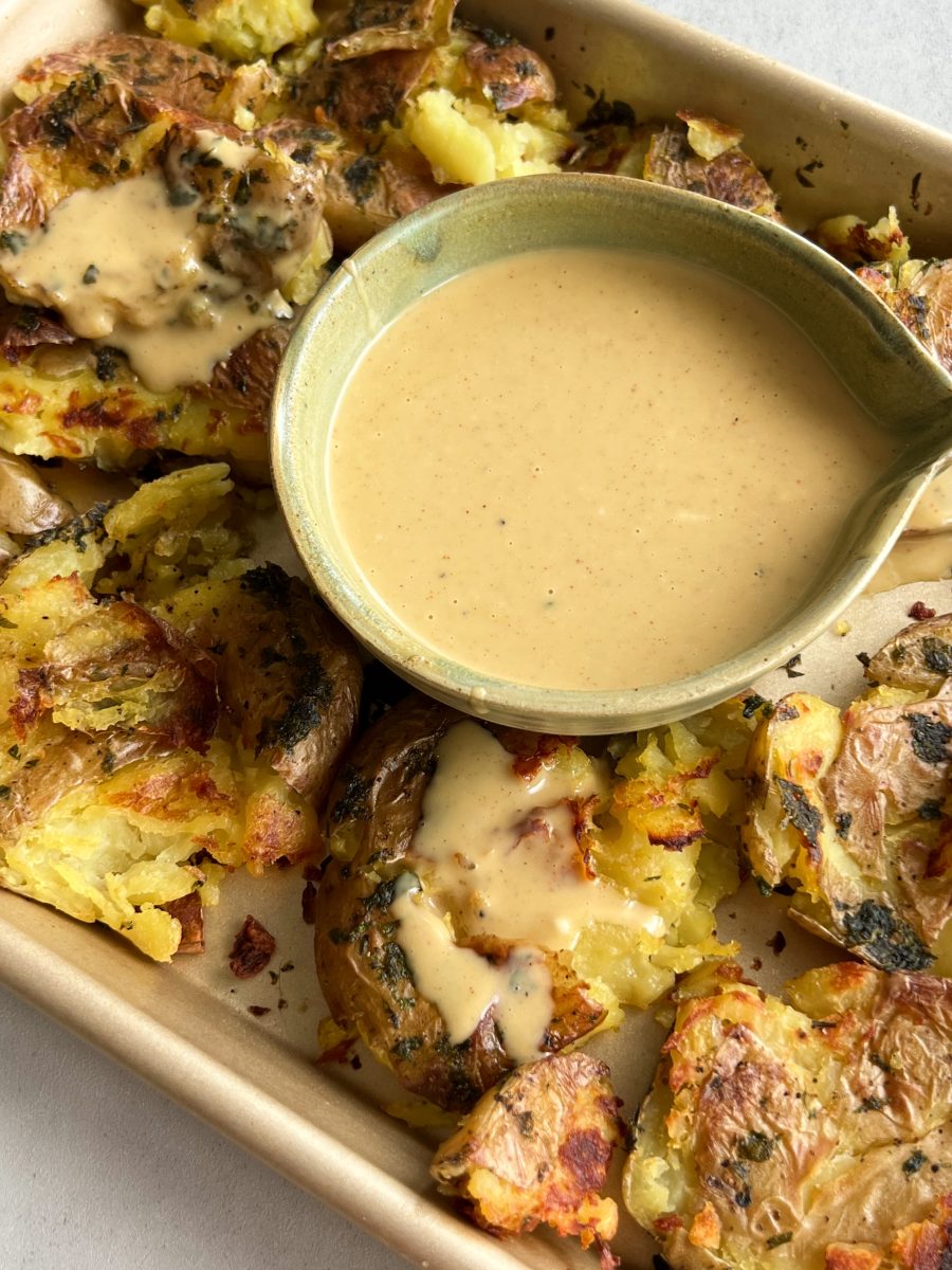 Smashed potatoes with a homemade honey mustard dipping sauce makes for the perfect side dish for dinner this week. The potatoes are boiled, smashed, then roasted until crispy and served with a delicious creamy sauce.