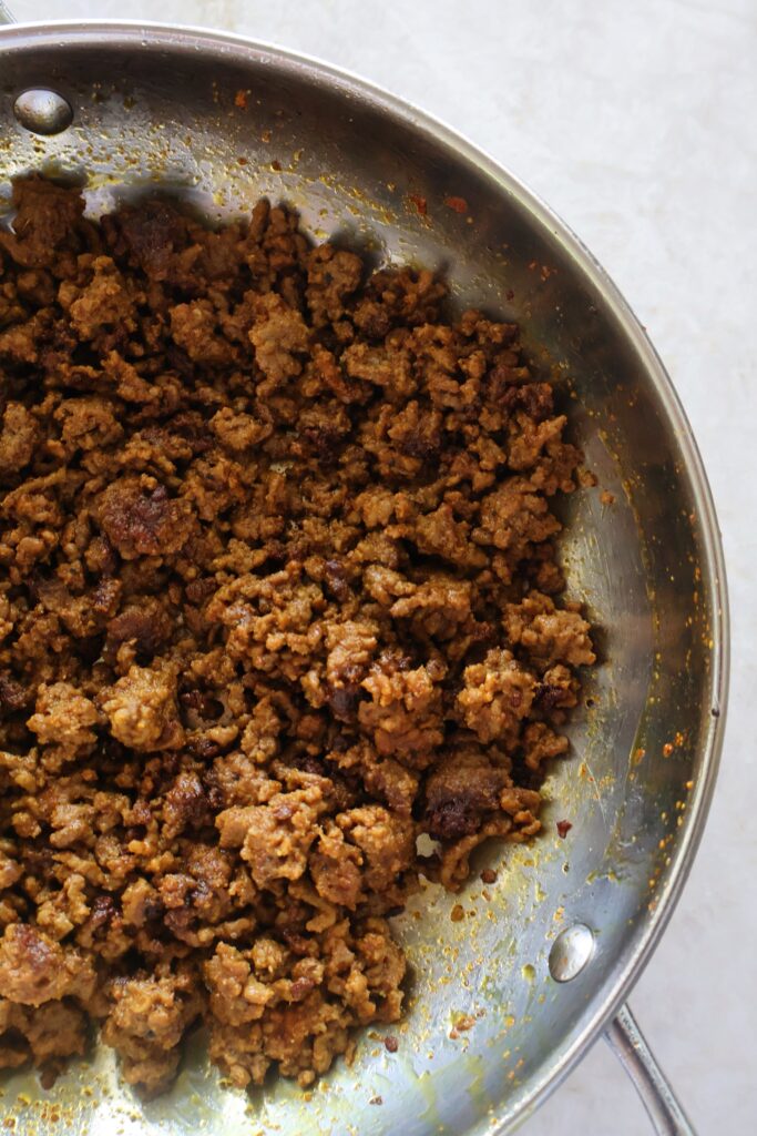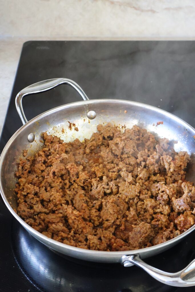 - Add the spices and cook on medium heat for about 15 minutes, until the meat is browned. If the spices start to stick to the pan, add about 2-3 tbsp of water to help loosen it up. Mix every few minutes. Towards the end, drizzle about 1 tbsp of hot honey and mix it into the beef.
