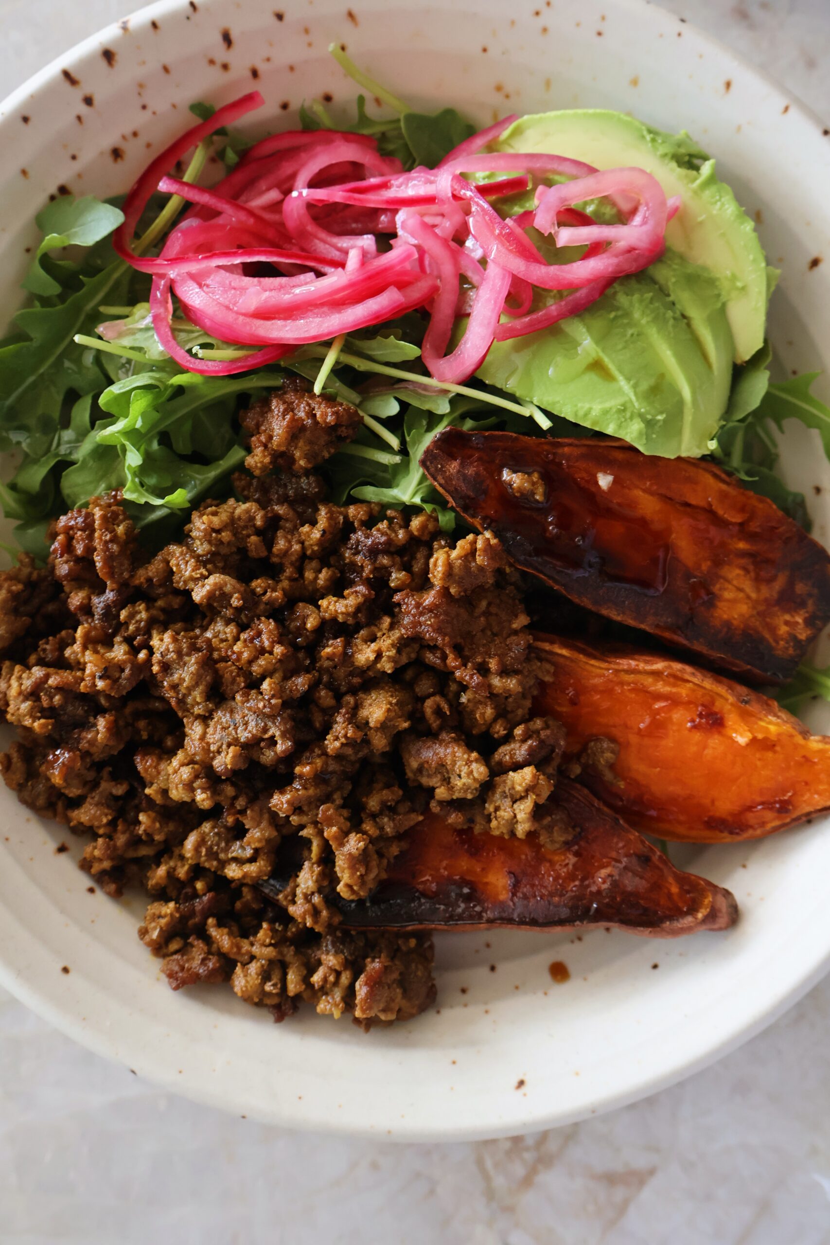 This recipe can easily double as meal prep for the week. Simply prepare all of the components, and assemble them together when ready to serve. The beef and sweet potatoes reheat well, and the pickled onions taste even better a day or two after they marinate.