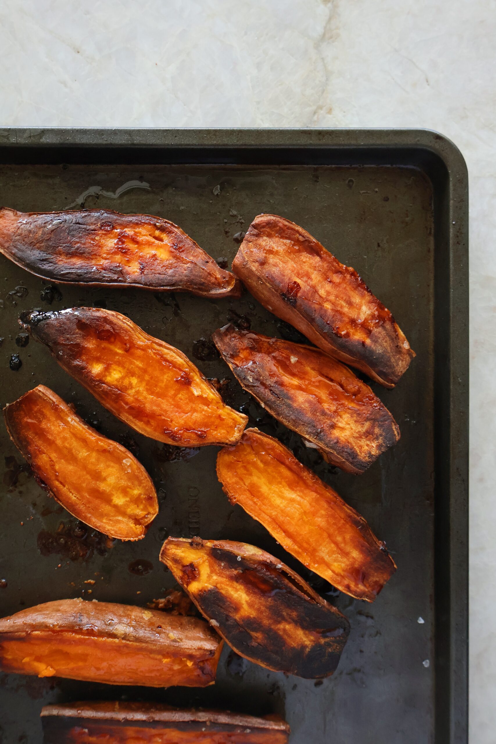 - Add the sliced sweet potatoes to a large sheet pan. Drizzle with olive oil and season with salt. Place the sweet potato halves face down onto the pan.