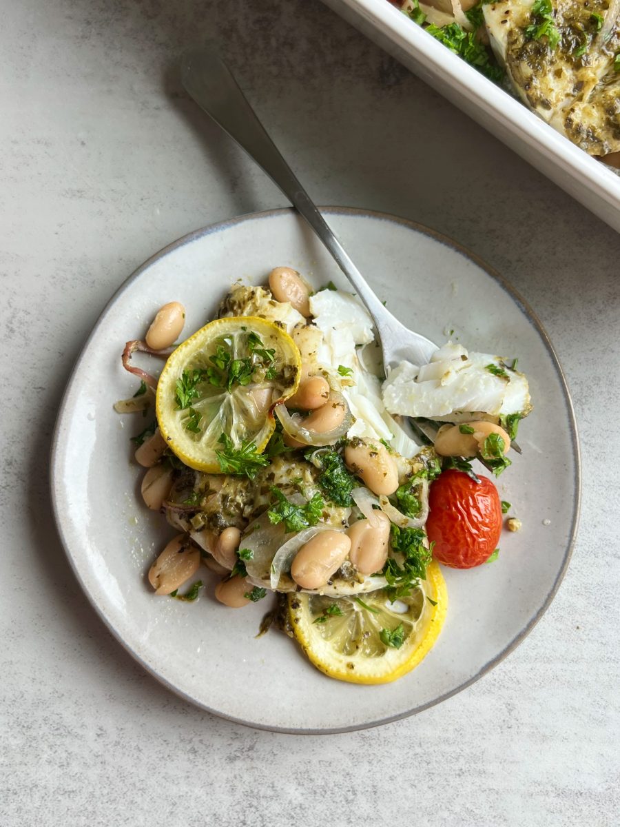 Lemon pesto baked cod with cannellini beans is a flavorful dinner that comes together in 30 minutes. It’s a delicious weeknight meal and a great way to incorporate more fish into your diet.