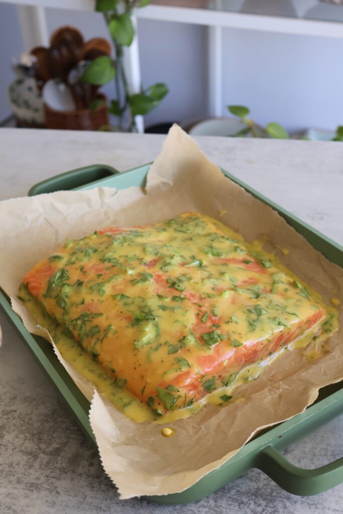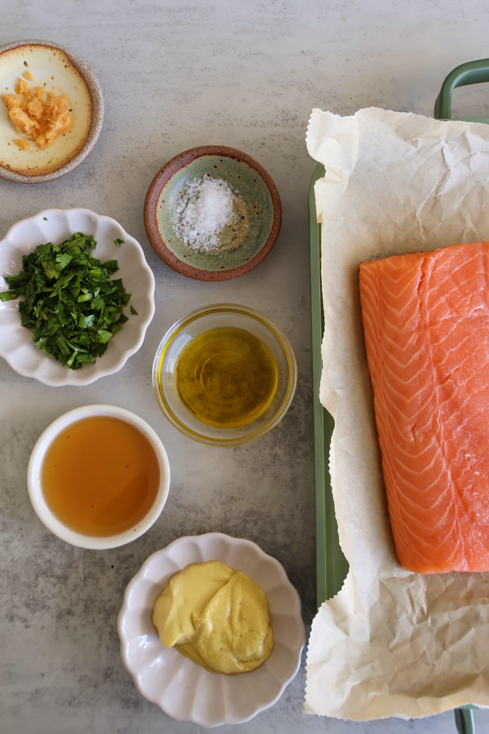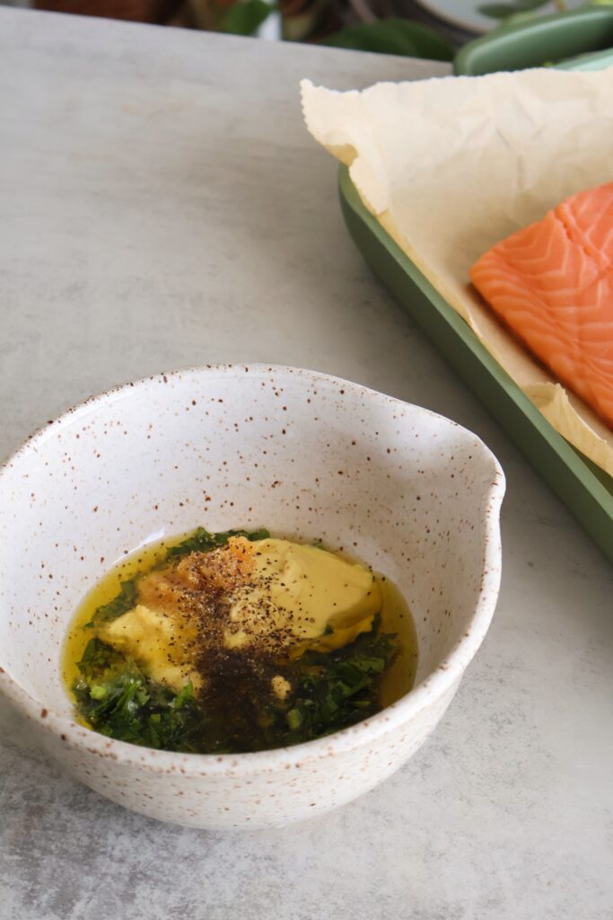 - In a small bowl, mix together the dijon, maple, olive oil, herbs, salt and garlic. Pour it over the salmon