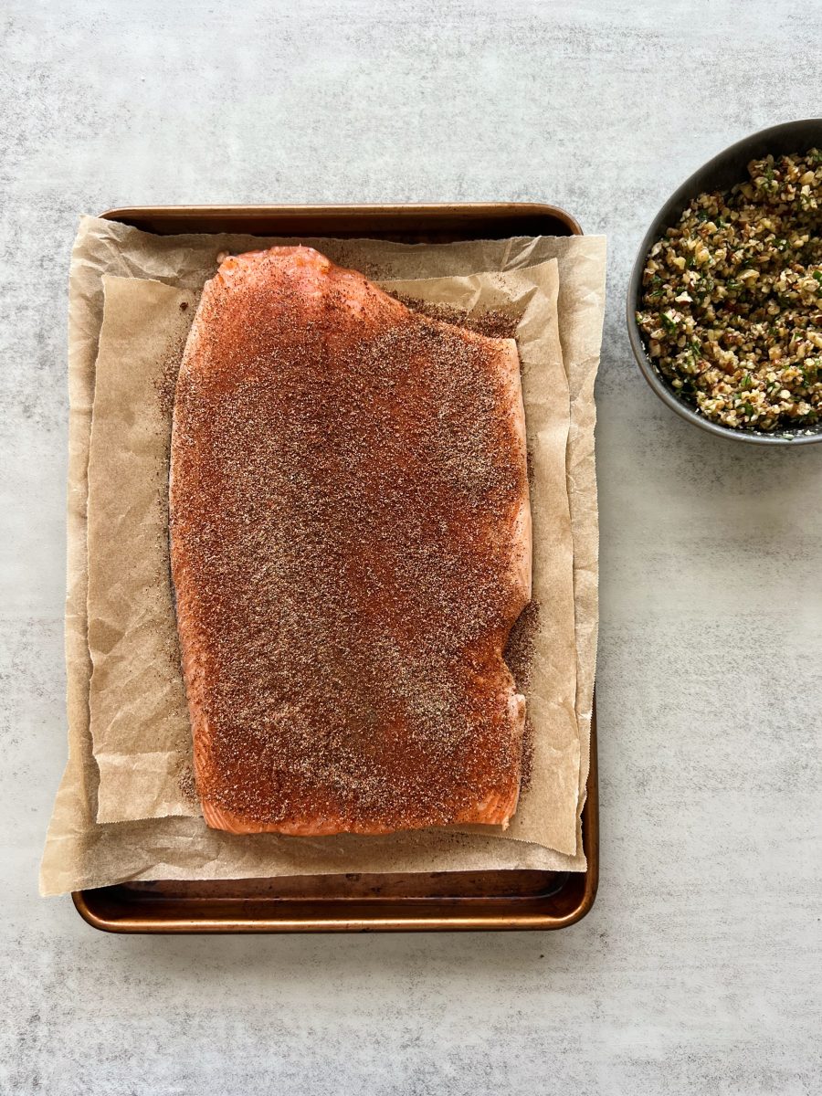 - Place the salmon onto a parchment lined sheet pan. Combine the spices together in a small bowl and press them into the salmon filet.