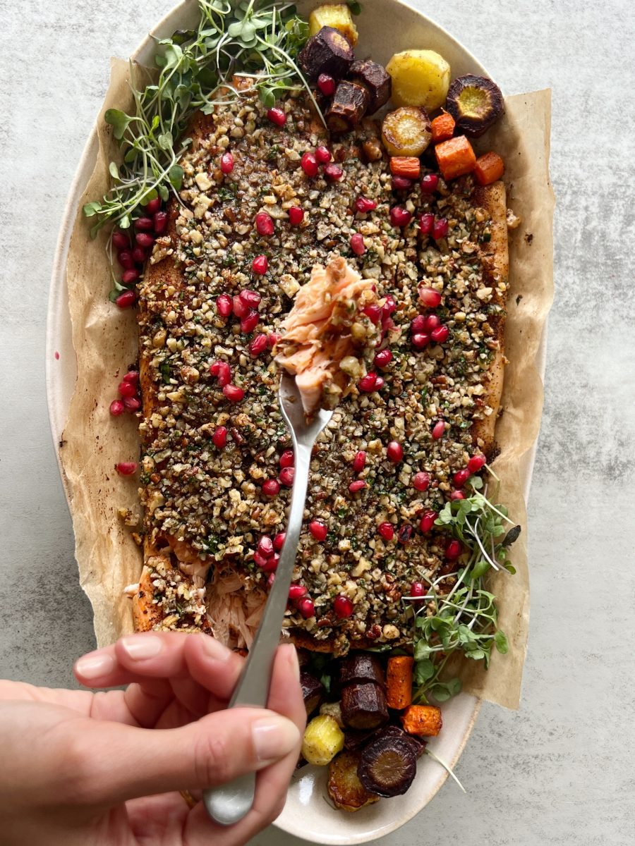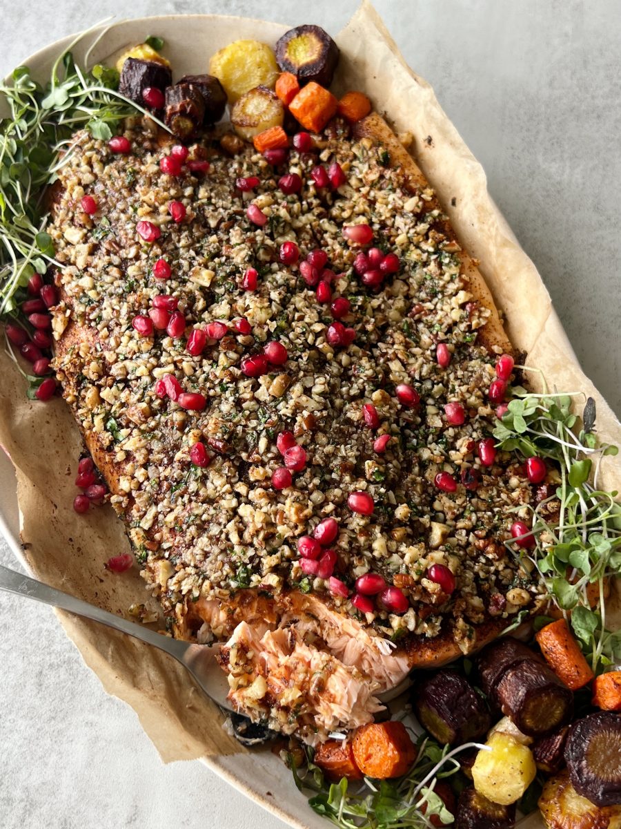 If you plan on serving this for a holiday dinner, I love adding a pop of color to the serving platter with roasted rainbow carrots, microgreens and pomegranate seeds. The flavors pair so well together while creating an eye-catching entree that’s flavorful and packed with omega-3 fats.