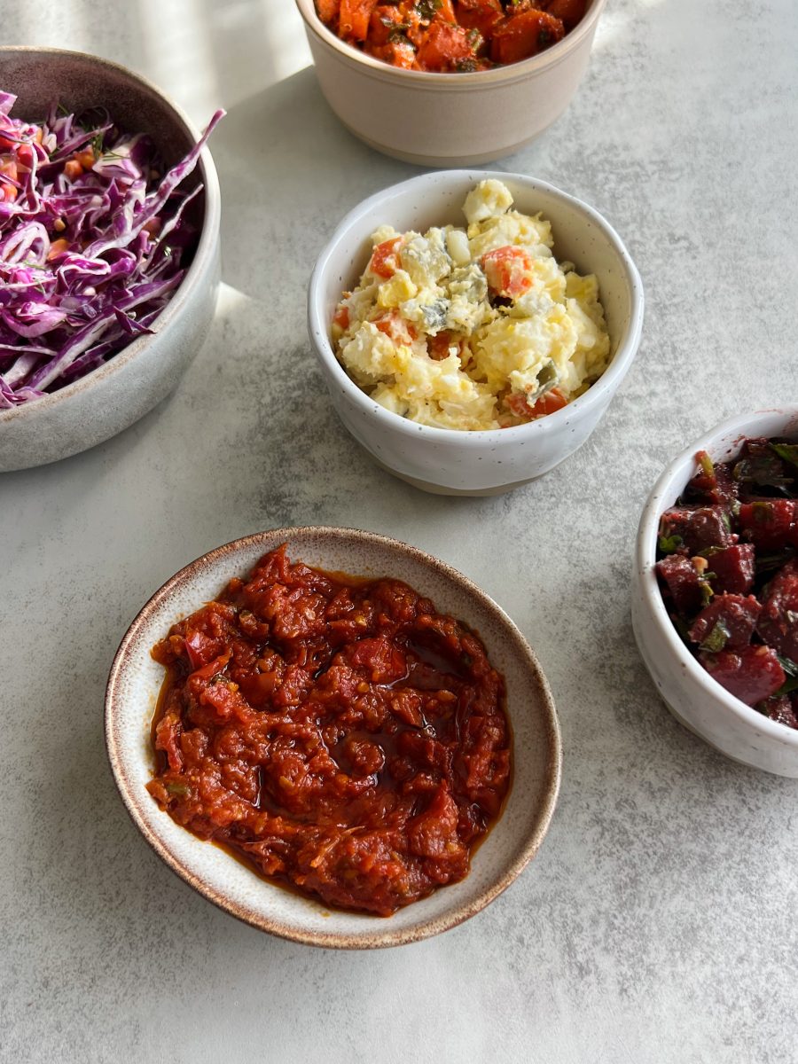 Matbucha is a condiment made with slow-cooked tomatoes, hot peppers, garlic, olive oil, and paprika. It’s a spicy tomato dip popular in the North African region, and one I grew up eating weekly for Shabbat dinners.