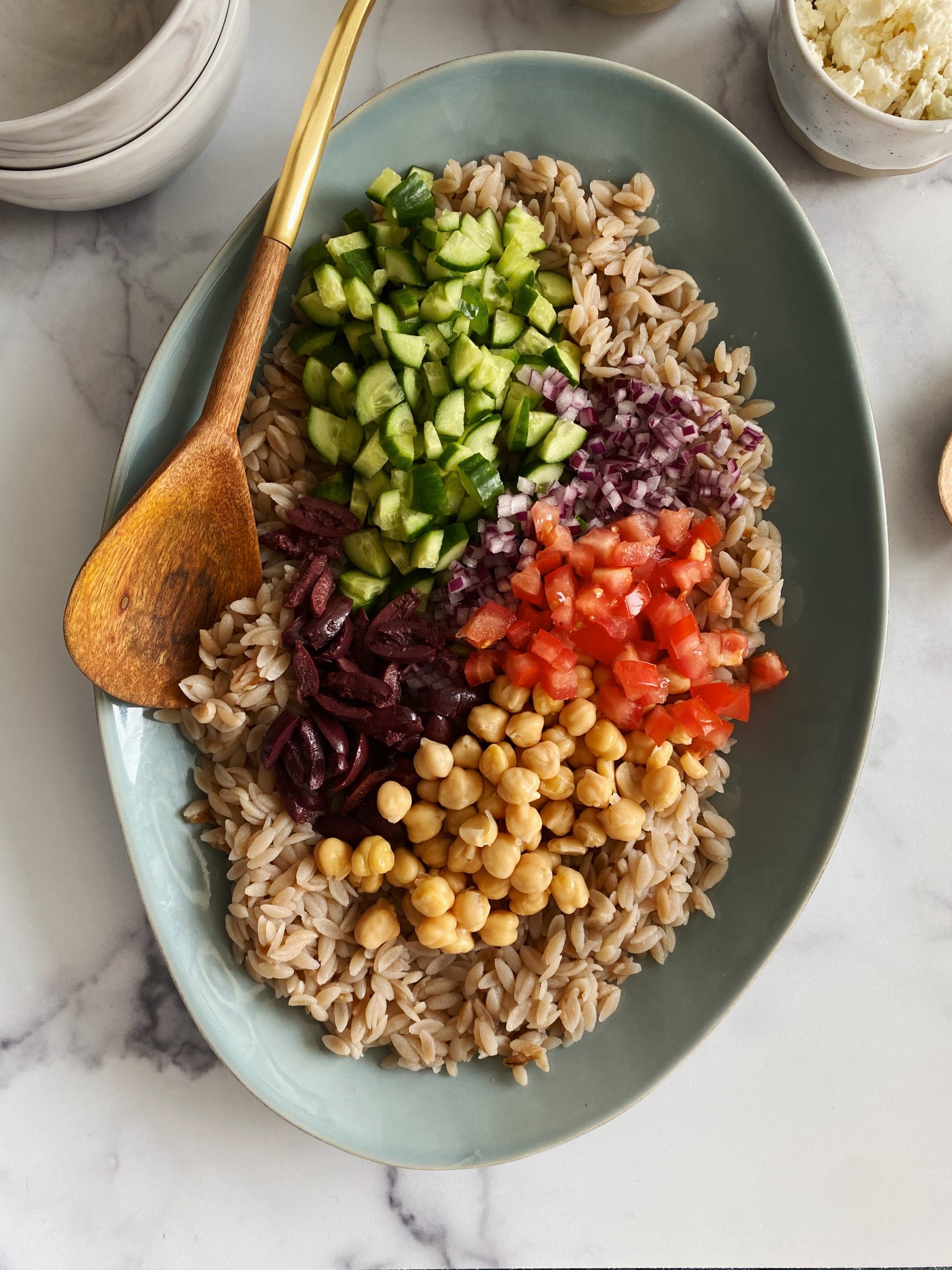 - Pour the orzo into a large mixing bowl. Drain and rinse your chickpeas and mix them in with the orzo and all topping ingredients. Toss together with the dressing.