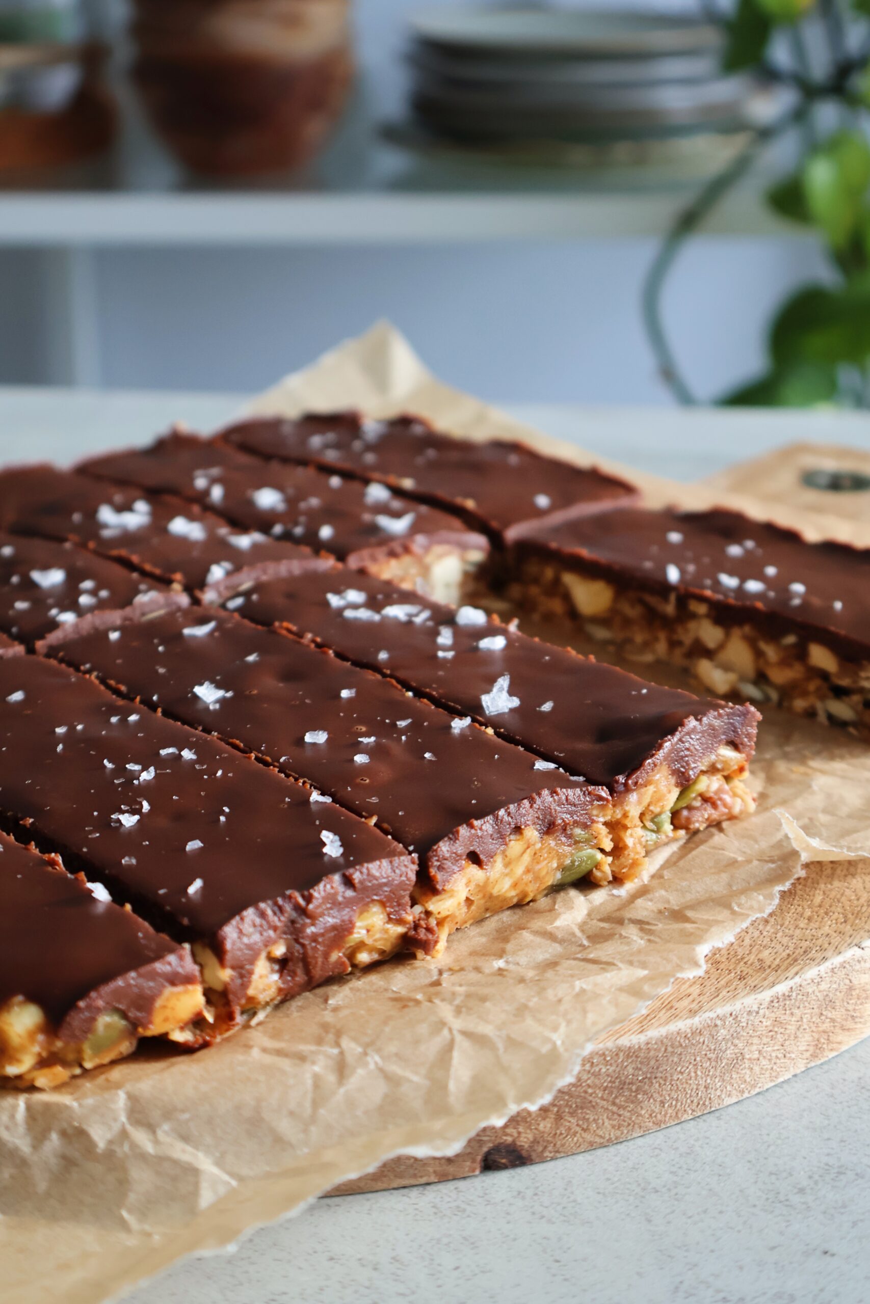 They’re made of rolled oats, a mix of nuts and seeds, shredded coconut, cinnamon and maple syrup. The bars are topped with a 2-ingredient chocolate ganache made of chocolate chips and coconut milk, and finished off with a sprinkle of flakey salt.