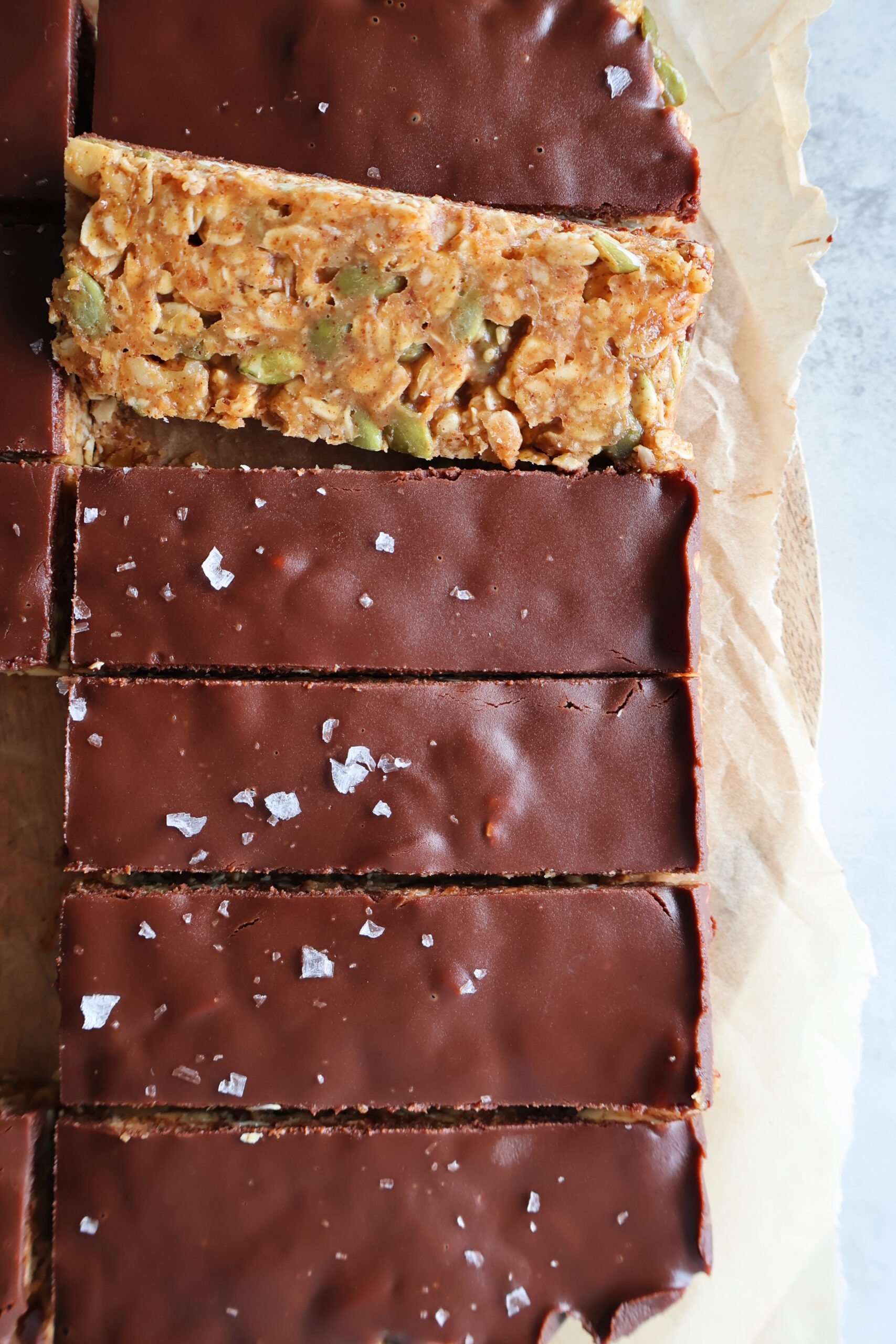 They get that perfect chewiness from the oats, with a little added crunch from the nuts and seeds. The chocolate on top is optional, but adds such a good flavor.