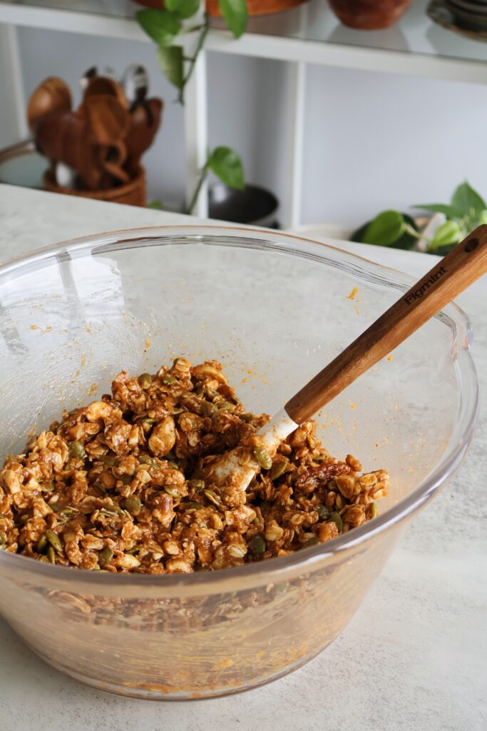 - Add in the oats, shredded coconut, chopped nut mix and cinnamon. Mix together using a rubber spatula until evenly incorporated.
