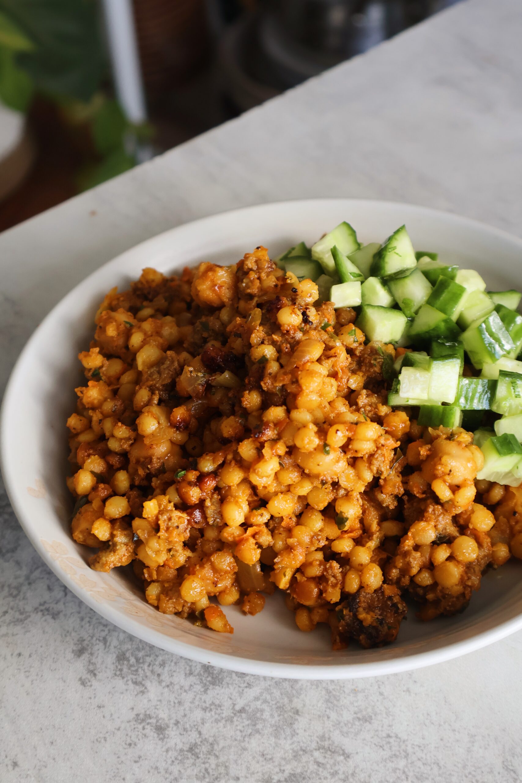 - Balanced and filling- you get protein from the beef and chickpeas, carbs from the couscous, and veggies from the onion and carrots