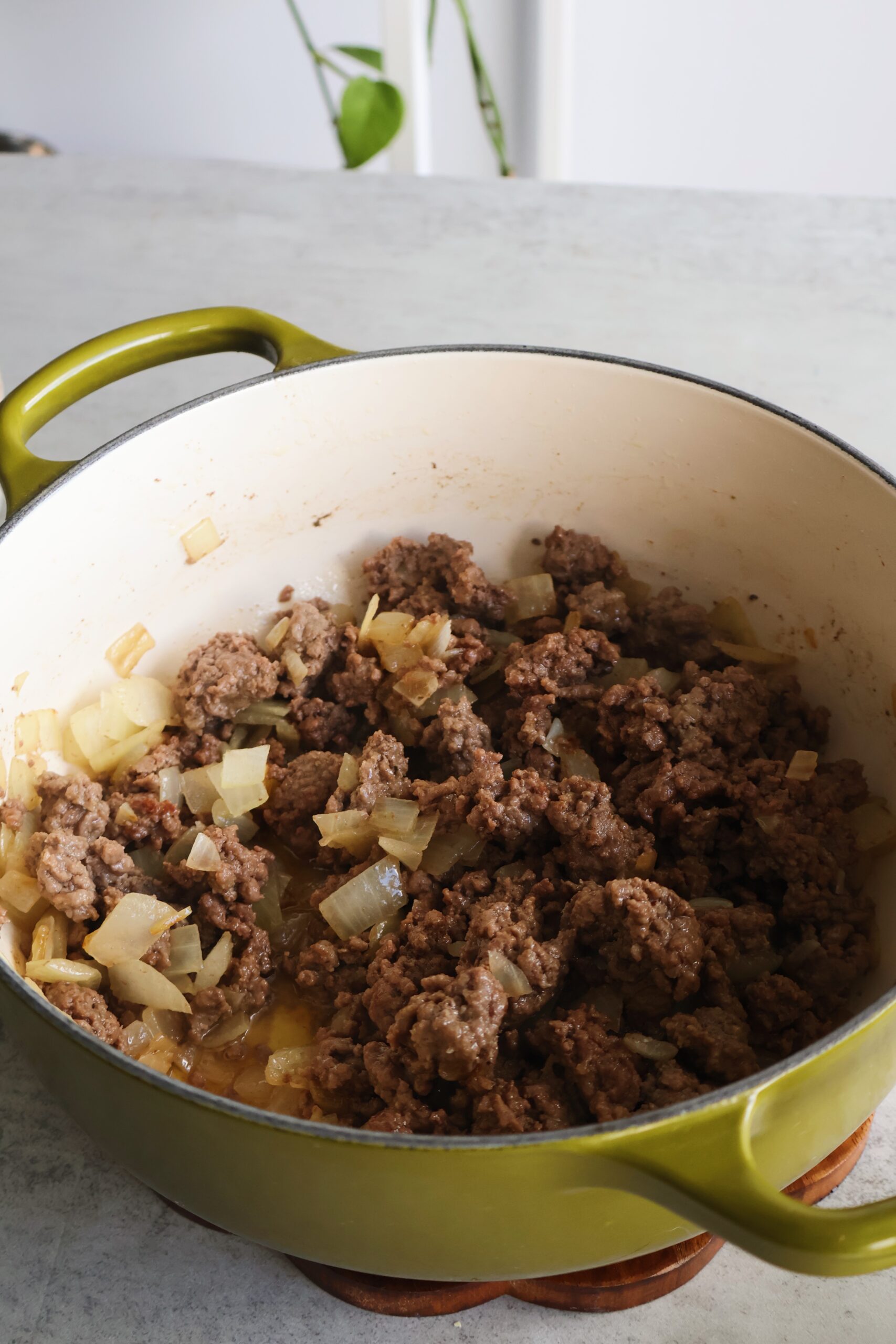 - Add the ground beef, breaking it apart in the pan. Cook the beef with the onions for 7-10 minutes to brown, stirring every couple of minutes.