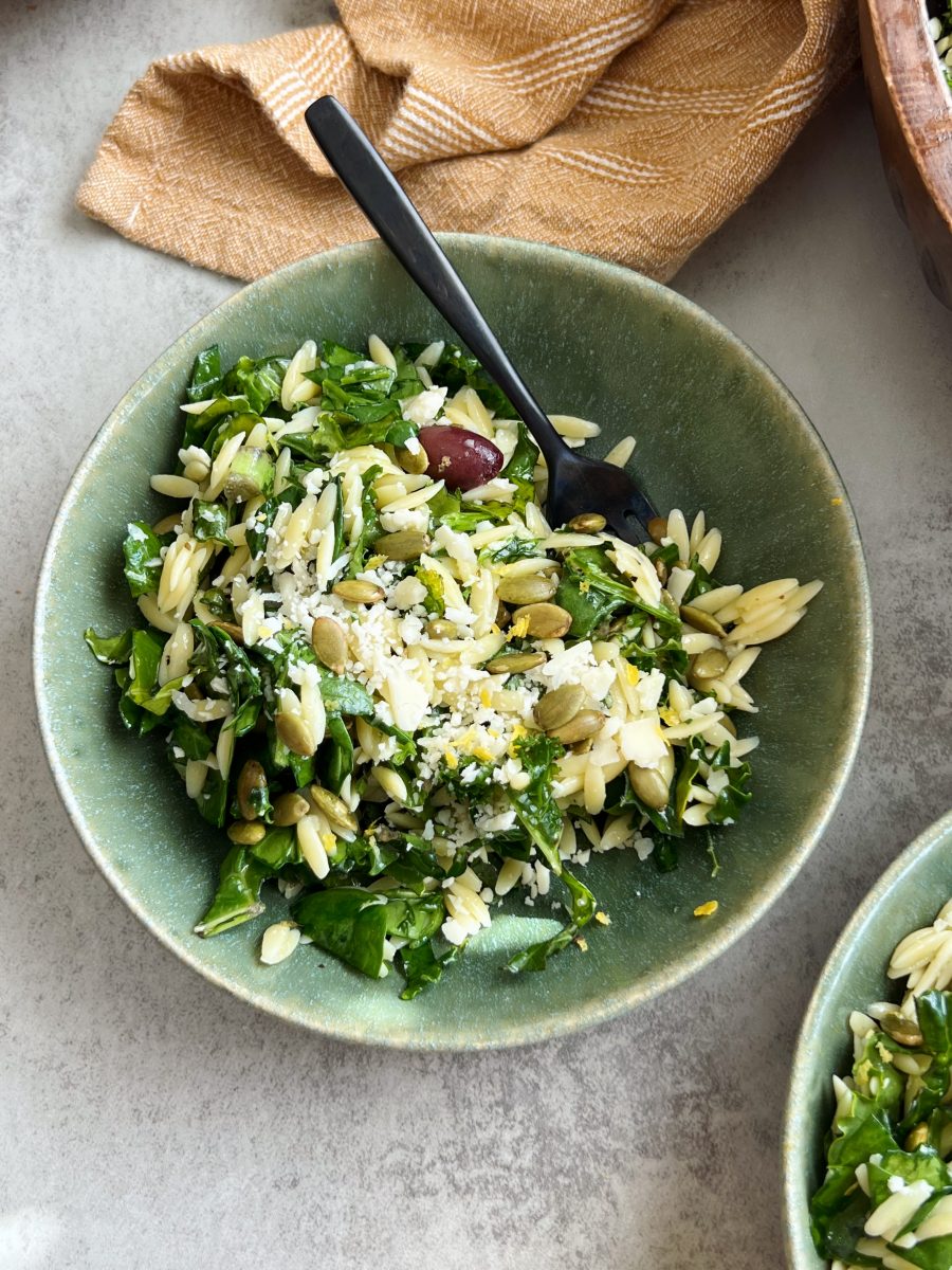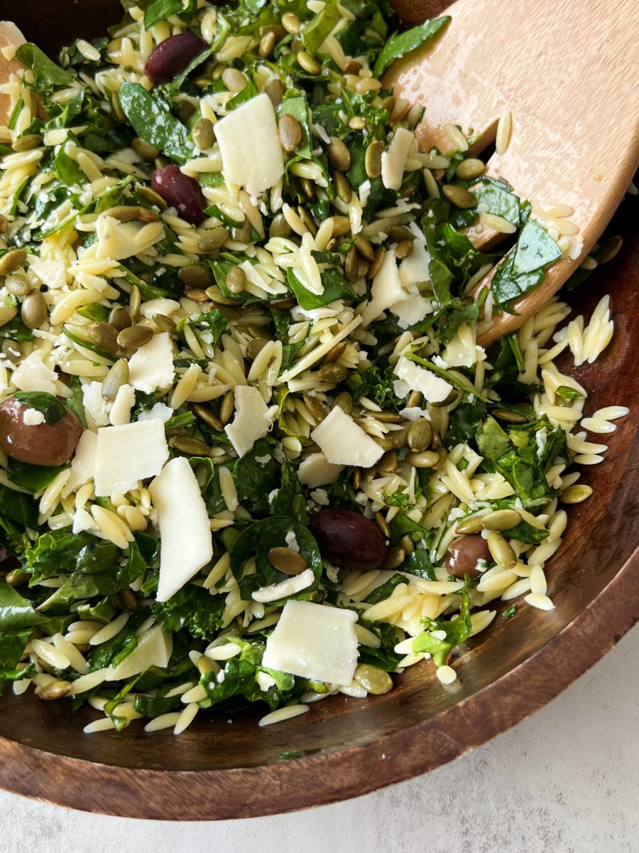 A simple orzo kale salad with lemon vinaigrette topped with parmesan, pumpkin seeds, and marinated olives. It’s the perfect weeknight meal!