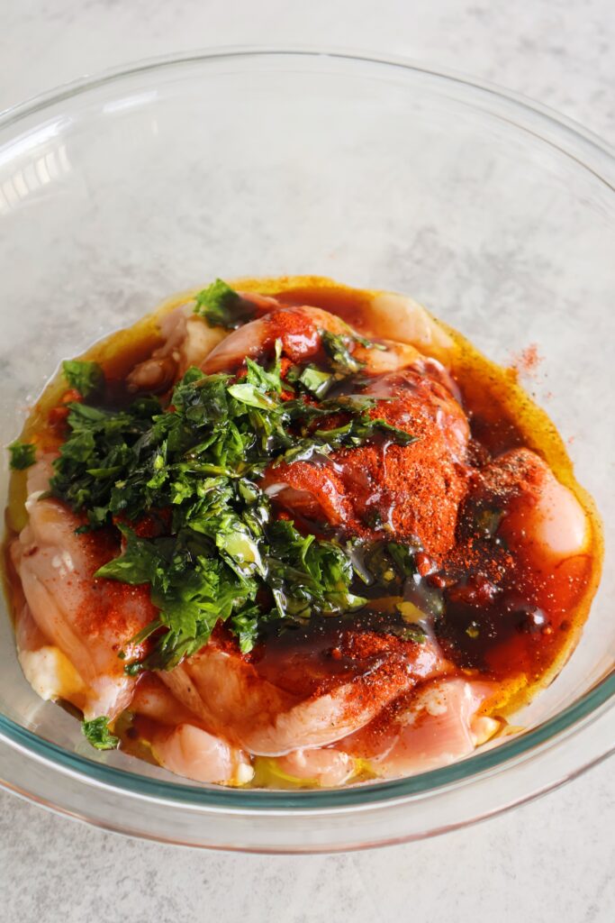 - In the meantime, marinate the chicken thighs with the olive oil, parsley, spices and date syrup