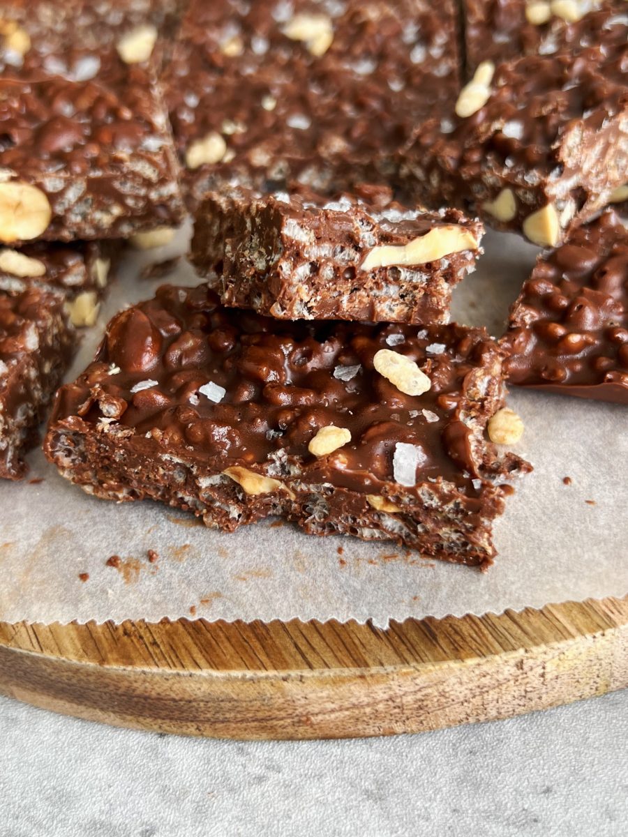 These delicious crunch bars are a fun spin off of traditional crunch bars, but with a peanut butter twist. They’re made with chocolate chips, natural peanut butter, crispy rice cereal and crushed peanuts.