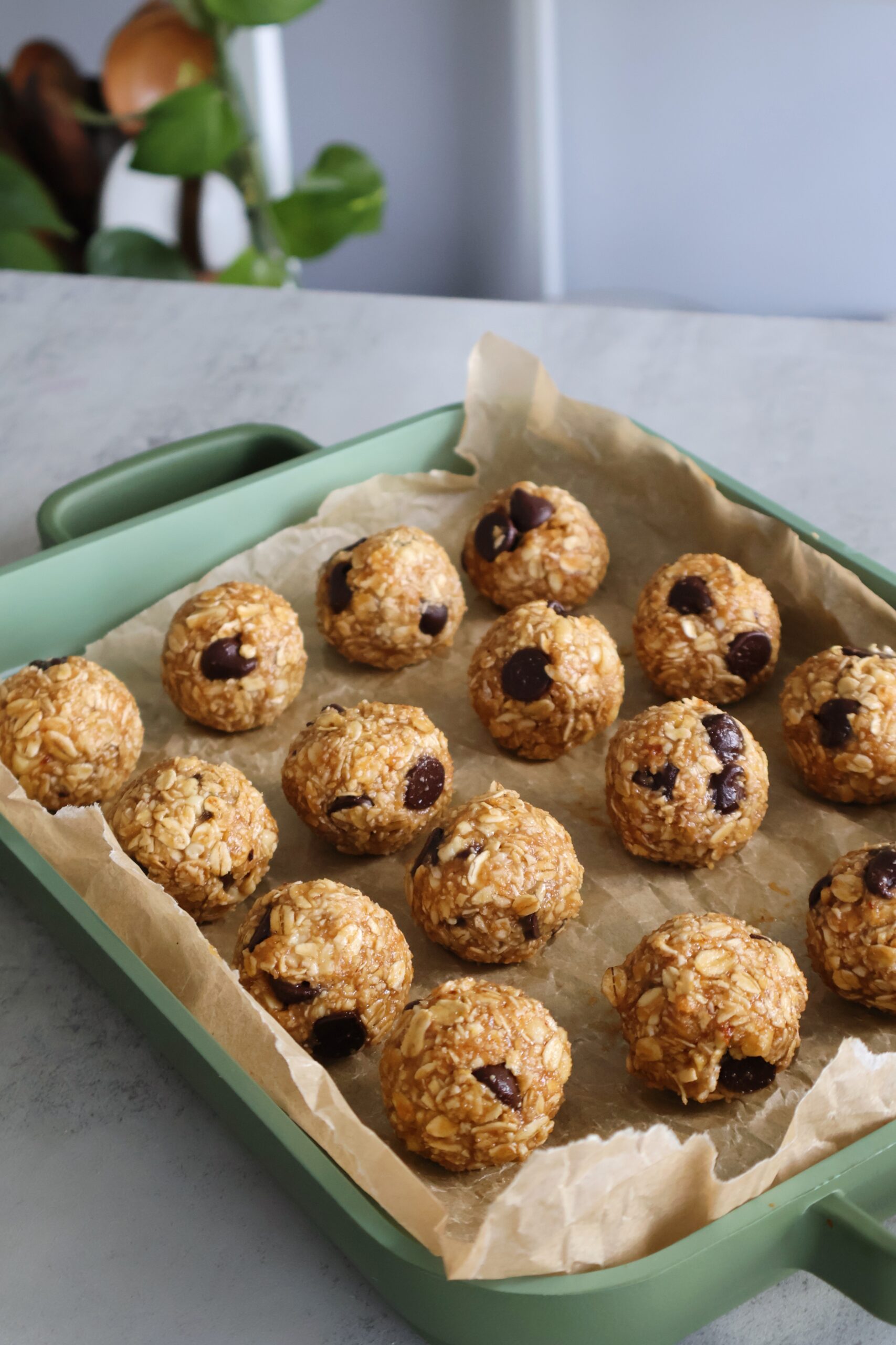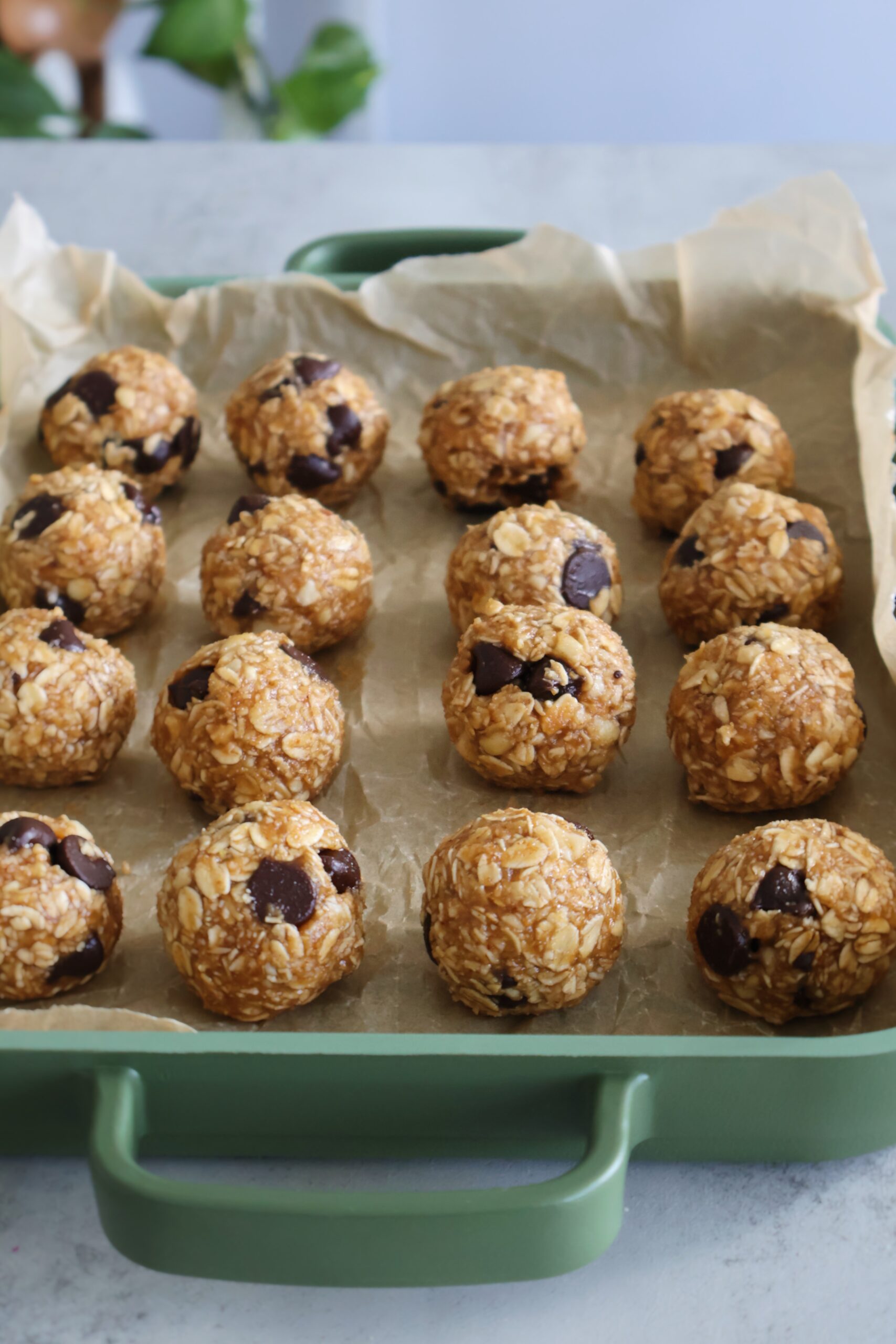 - Layer the energy bites onto a parchment lined plate or tray and freeze for 30 minutes until firm.