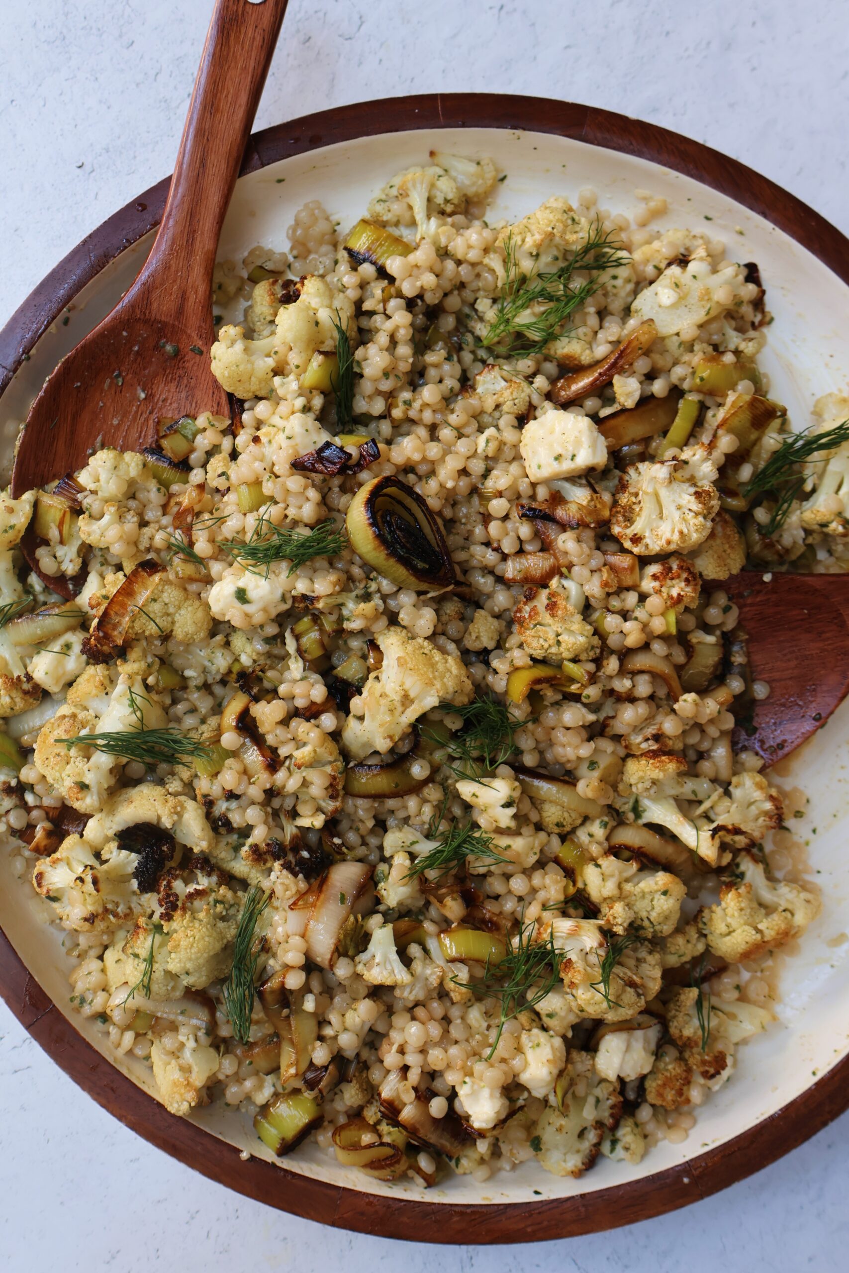 - Assemble the salad by adding the pearl couscous, roasted cauliflower, sauteed leeks and feta cheese to a bowl or platter. Top with the dressing and toss together.