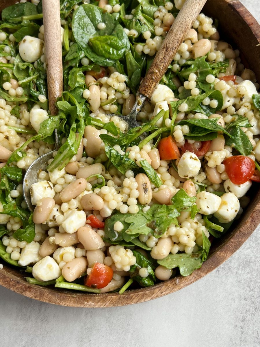 Pesto pearl couscous salad with cannellini beans is a delicious and flavorful dish to serve with your favorite protein and sides!