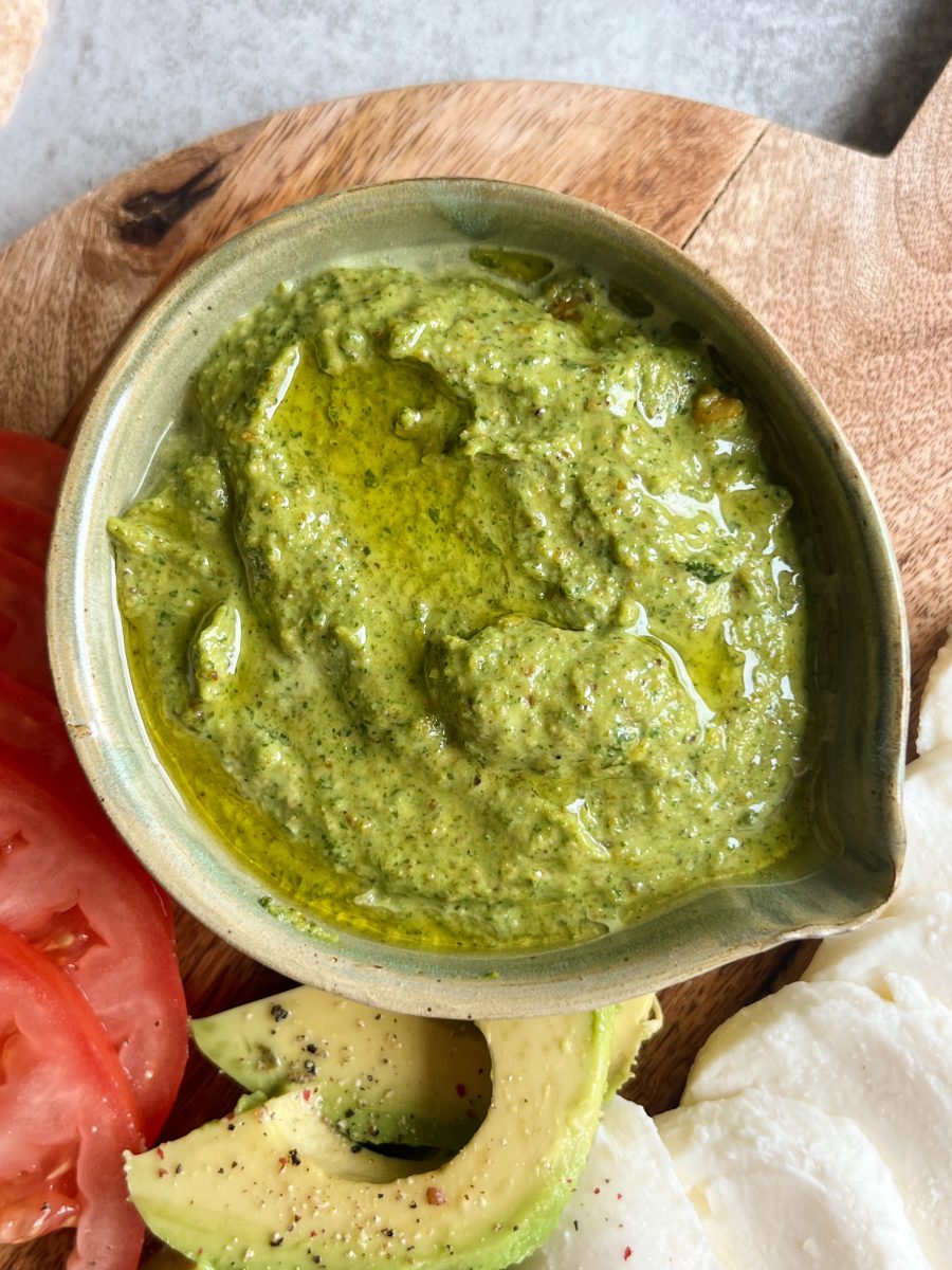 The homemade pistachio pesto is one of my favorite spreads to have on hand, and can be used on wraps, sandwiches or paired with your favorite pasta