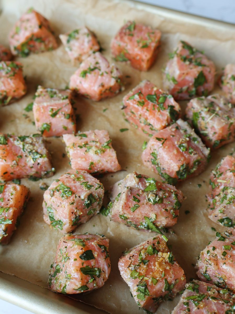 - Toss the salmon cubes with the chopped parsley, Italian seasoning, garlic powder, salt & pepper, olive oil and lemon juice, making sure everything is evenly coated