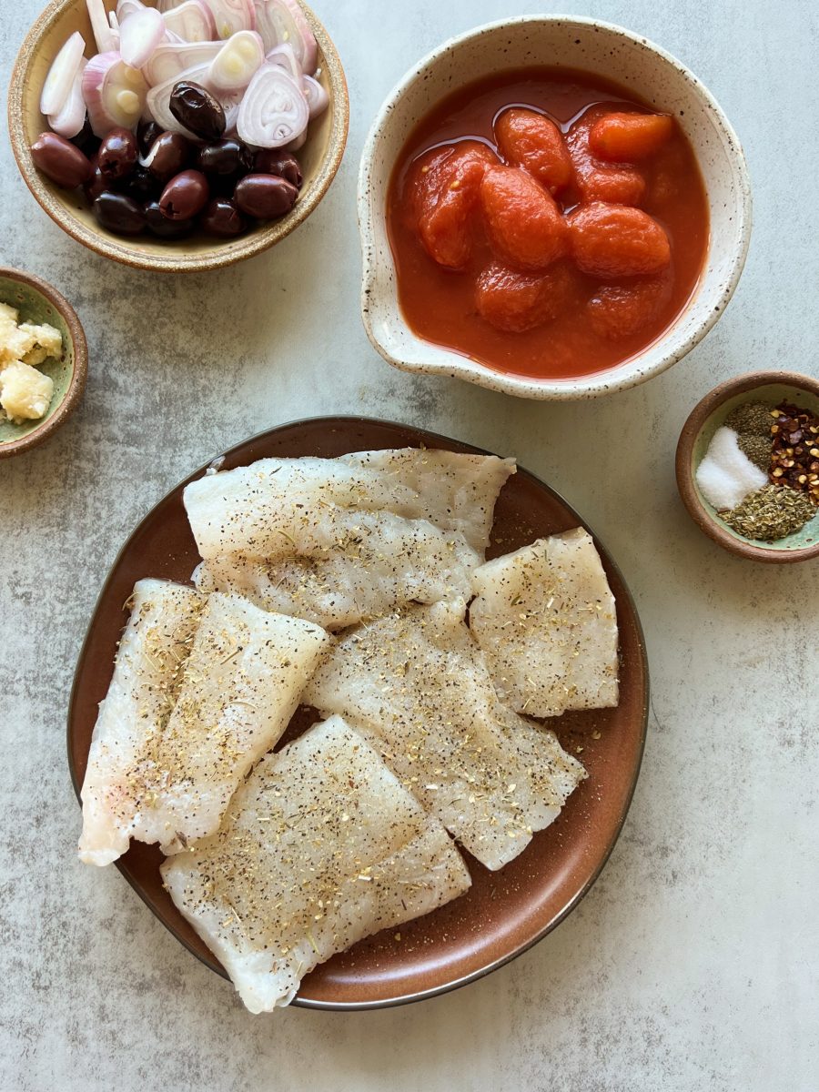 Cod fillets are seasoned with a little salt, pepper and Italian seasoning, then cooked in a simple tomato sauce made from canned whole tomatoes, sauteed shallots and garlic, olives and a few spices.