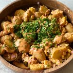 While I do enjoy a classic potato salad, I love this version that uses a combination of mayo and olive oil. It’s a great way to still get a creamy dressing, without the mayo overpowering the taste.