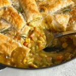 Traditionally, pot pie is made with a layer of pie crust as a topping and filled with shredded chicken or beef. I absolutely love this vegetarian/vegan-friendly version with the puff pastry twist.