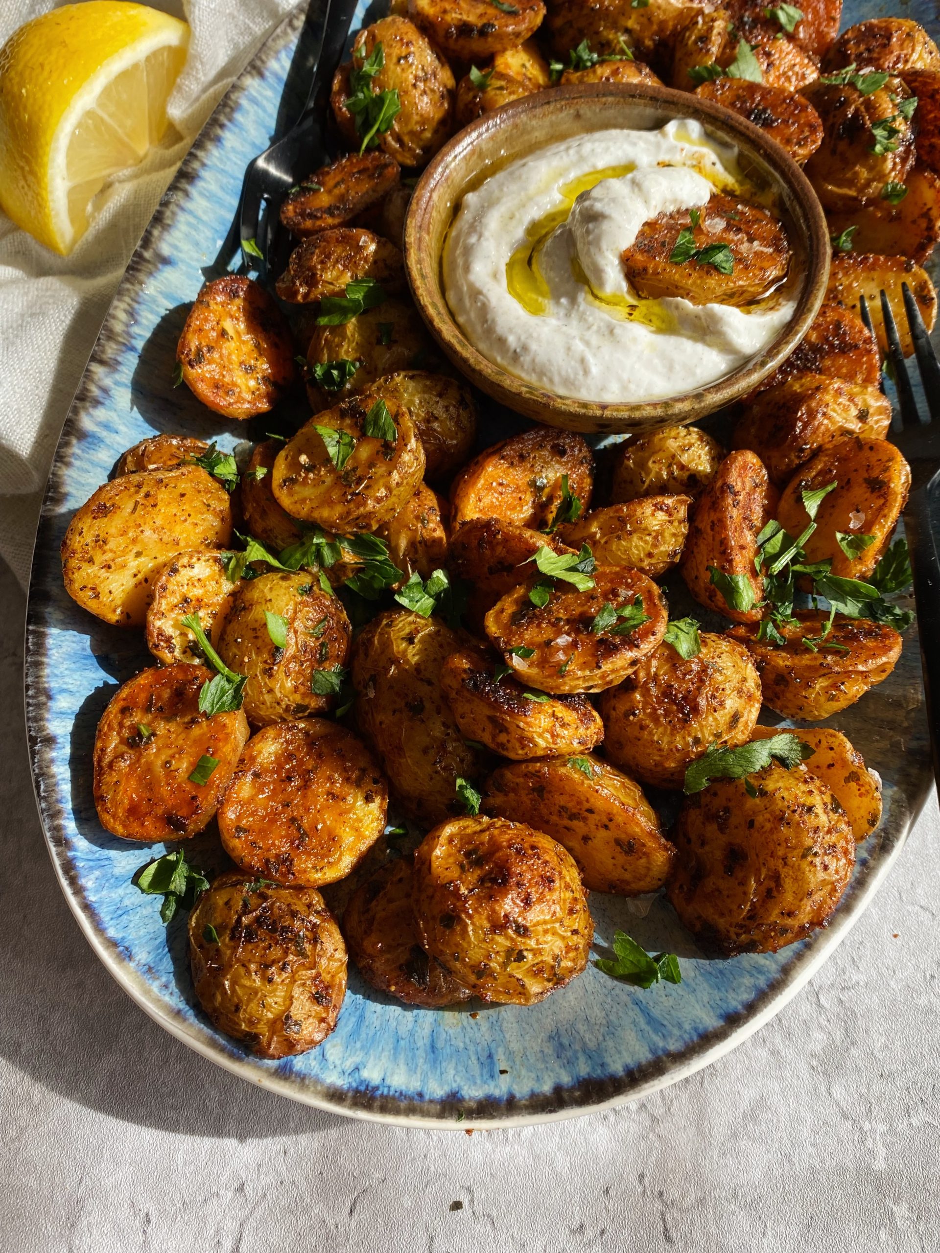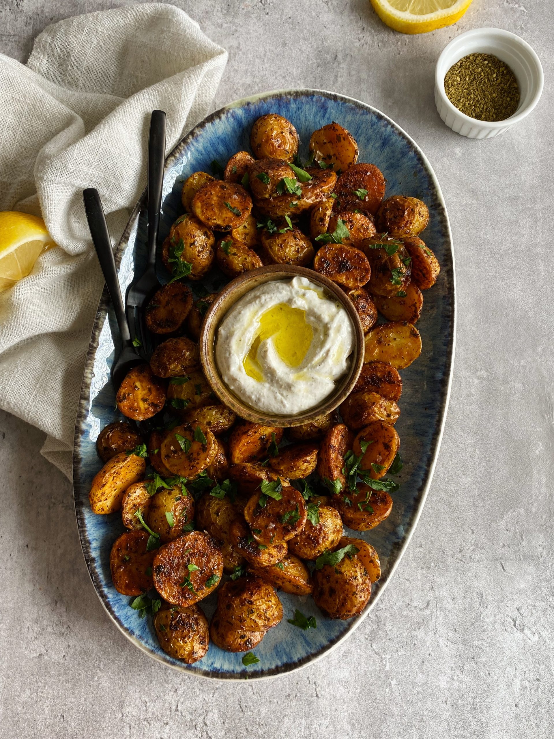 Roasted baby potatoes are the perfect side dish to any meal! Serve them with your favorite main course alongside the simple creamy za’atar yogurt dip.