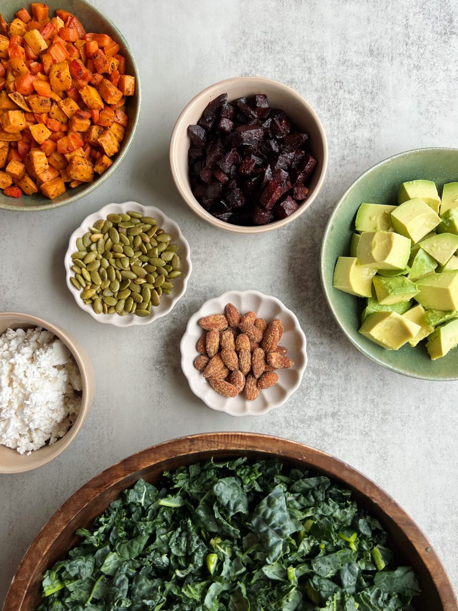 This beautiful, color-packed kale salad is the perfect nourishing meal. Its filled with feel-good ingredients like tuscan kale, roasted beets and carrots, avocado, and nuts & seeds.
