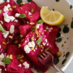 Sweet roasted beet pasta with crumbled feta and chopped nuts is the perfect way to change up your pasta game. Made with just a few simple ingredients, this vibrant sauce comes out so creamy and delicious.