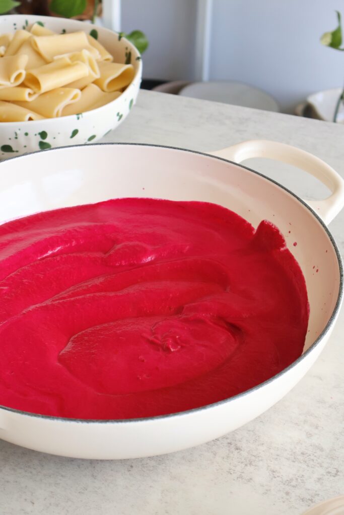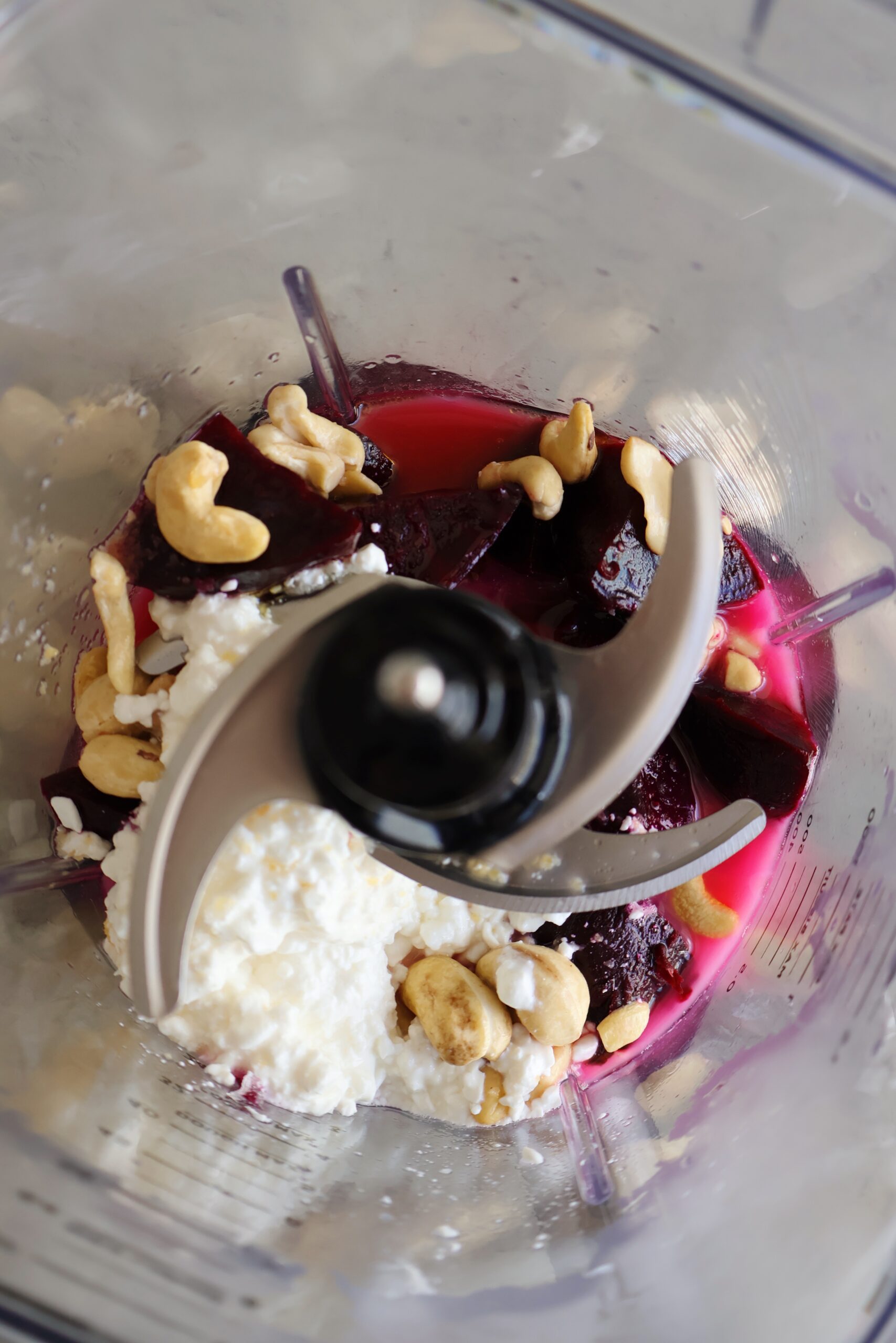 - Once the beets are ready, blend them together with some reserved pasta water, raw cashews, ricotta, lemon juice, olive oil, garlic and salt