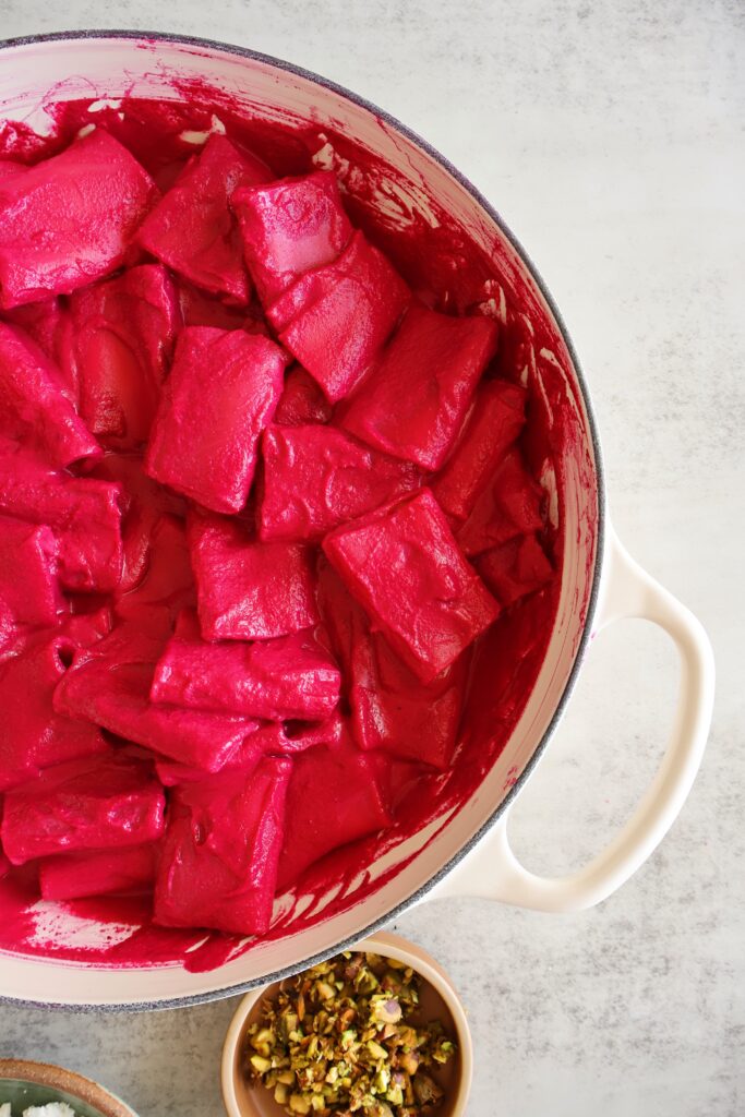 - Heat a large pan or pot over medium/low heat and pour in the beet sauce. Cook for about 1 minute