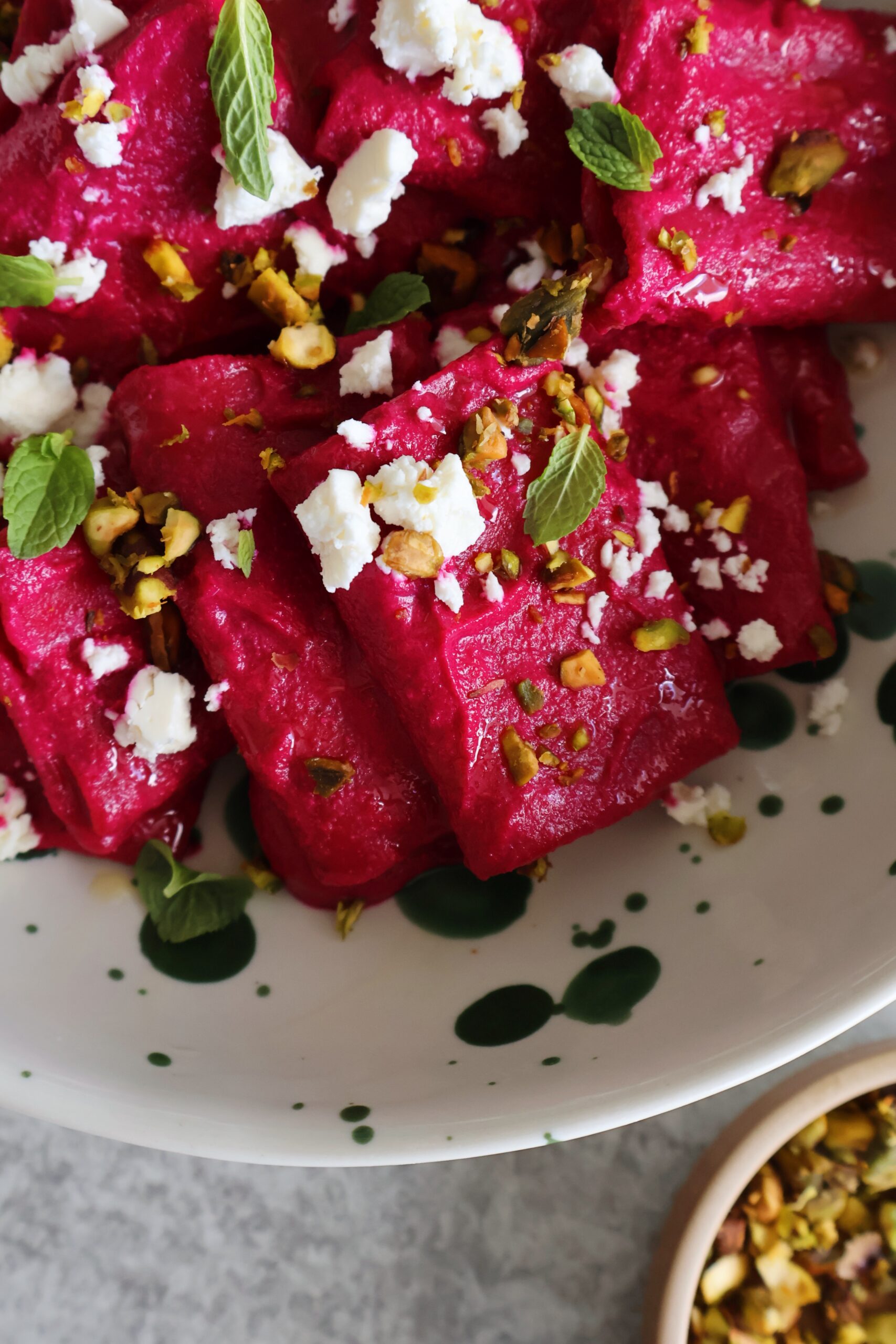 It’s made by blending roasted beets with ricotta cheese, cashews, milk and a few other simple flavorings. The gorgeous pink sauce then gets mixed in with your favorite pasta and garnished with fresh herbs and nuts.