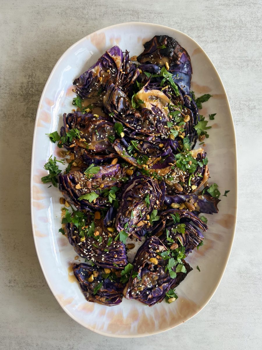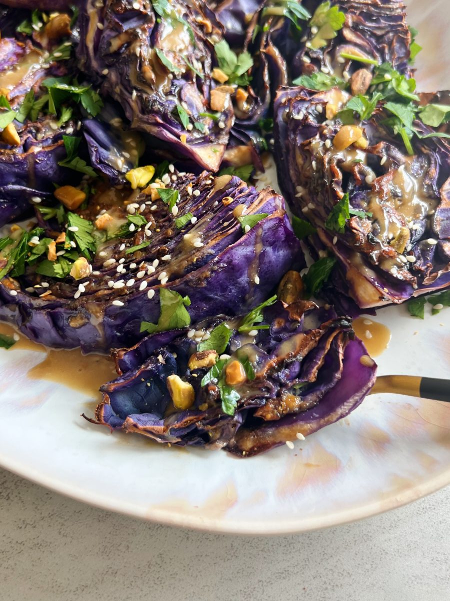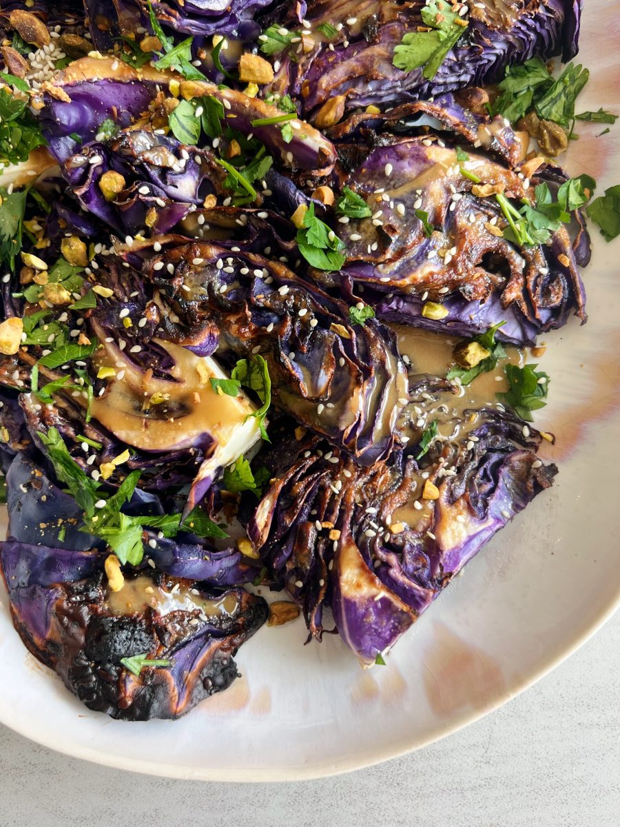 Level up your side dish with this roasted cabbage and maple tahini. It’s sweet & savory, and so delicious topped with crushed pistachios and fresh herbs.