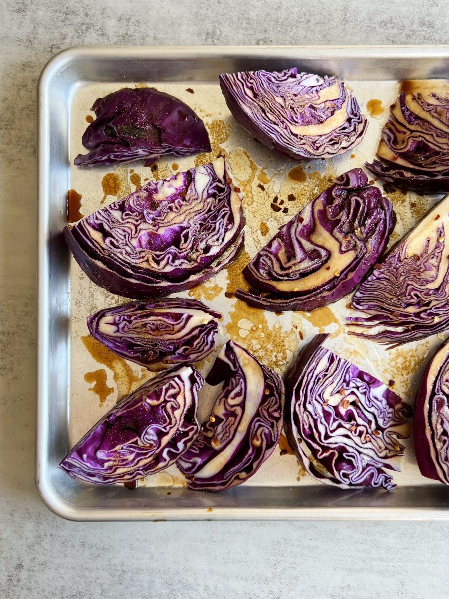 - Cut your cabbage into small wedges then place them on a sheet pan. Season with a little salt, garlic powder and red pepper flakes and drizzle with coconut aminos and sesame oil