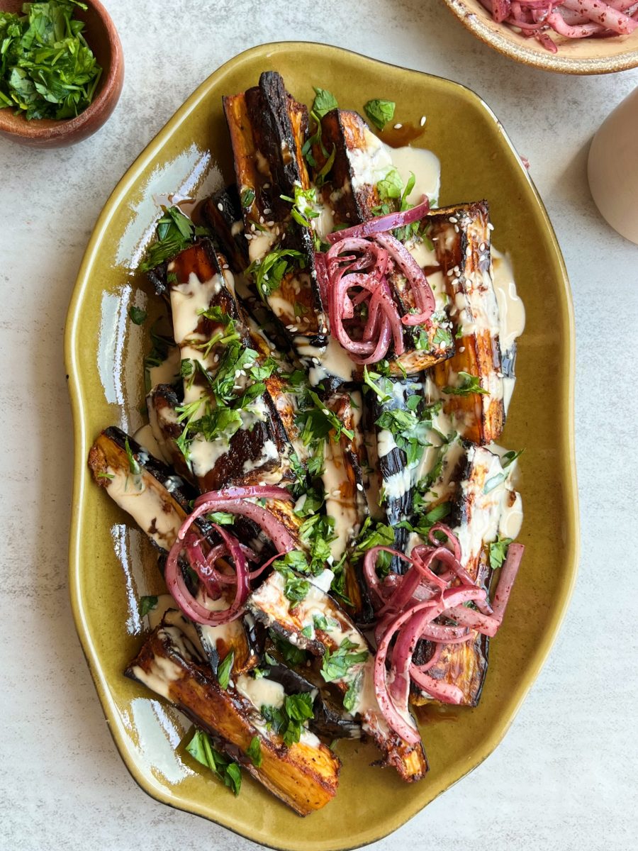 These roasted eggplant sticks are cooked until crisp then topped with a savory miso tahini sauce, a drizzle of date syrup, and my go-to sumac marinated onions.