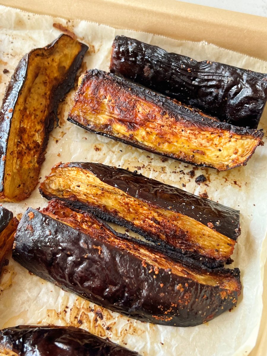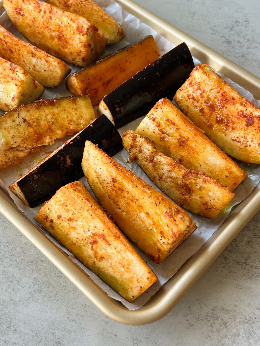 - Toss the eggplant with the olive oil and spices and layer it on a sheet-pan. Roast for about 30 minutes, until browned