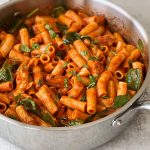 I love a hearty, yet nourishing, dinner recipe during the week and this roasted red pepper pasta is the perfect all-in-one meal. This dish is made with a dairy-free roasted red pepper sauce that gets tossed with cooked pasta, spinach and grilled chicken.