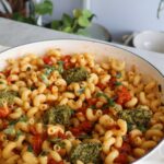 I used one of my favorite pasta varieties- cavatappi- and topped the dish with fresh basil and homemade pesto. This recipe is one of those simple ones with only 10 minutes of prep time, yet its bursting with flavor.