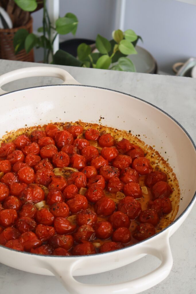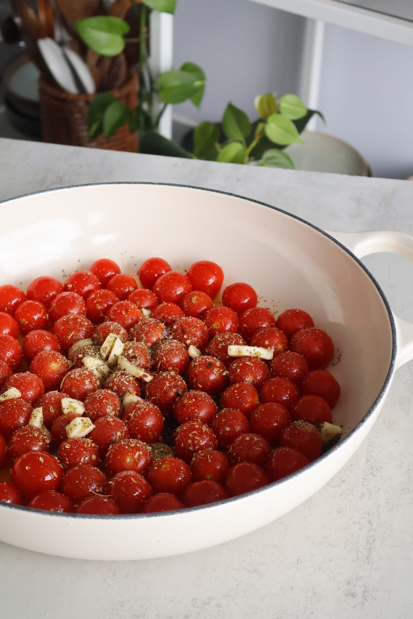 The cherry tomatoes get roasted with garlic, olive oil, Italian seasoning, chili flakes and salt & pepper. They come out sweet and juicy and get mixed with some pasta water to create the base of the sauce.