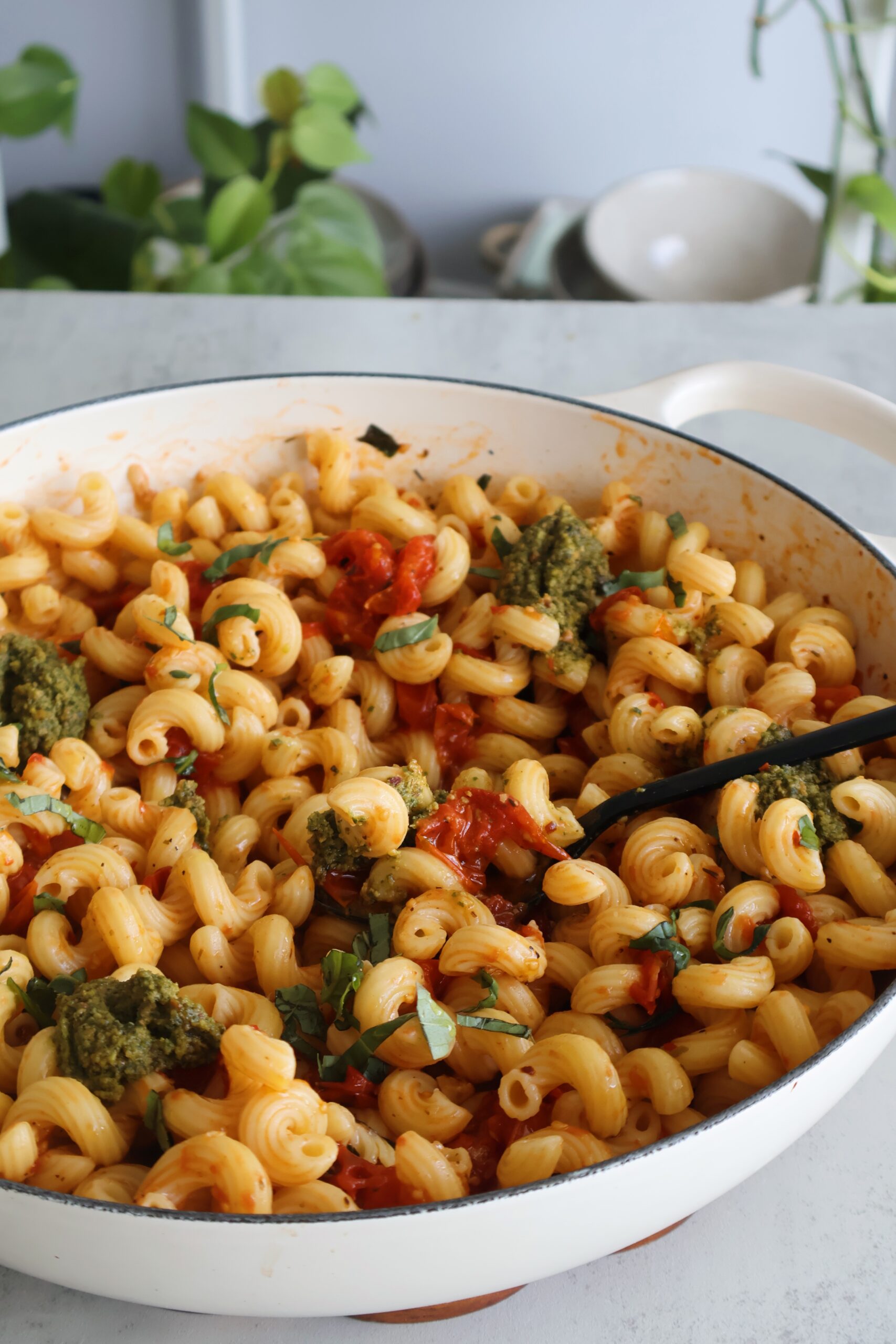 Once everything is evenly mixed, garnish the dish with store-bought or homemade pesto and some extra basil. You can serve this dish with a side of grilled chicken, baked salmon or a side salad.
