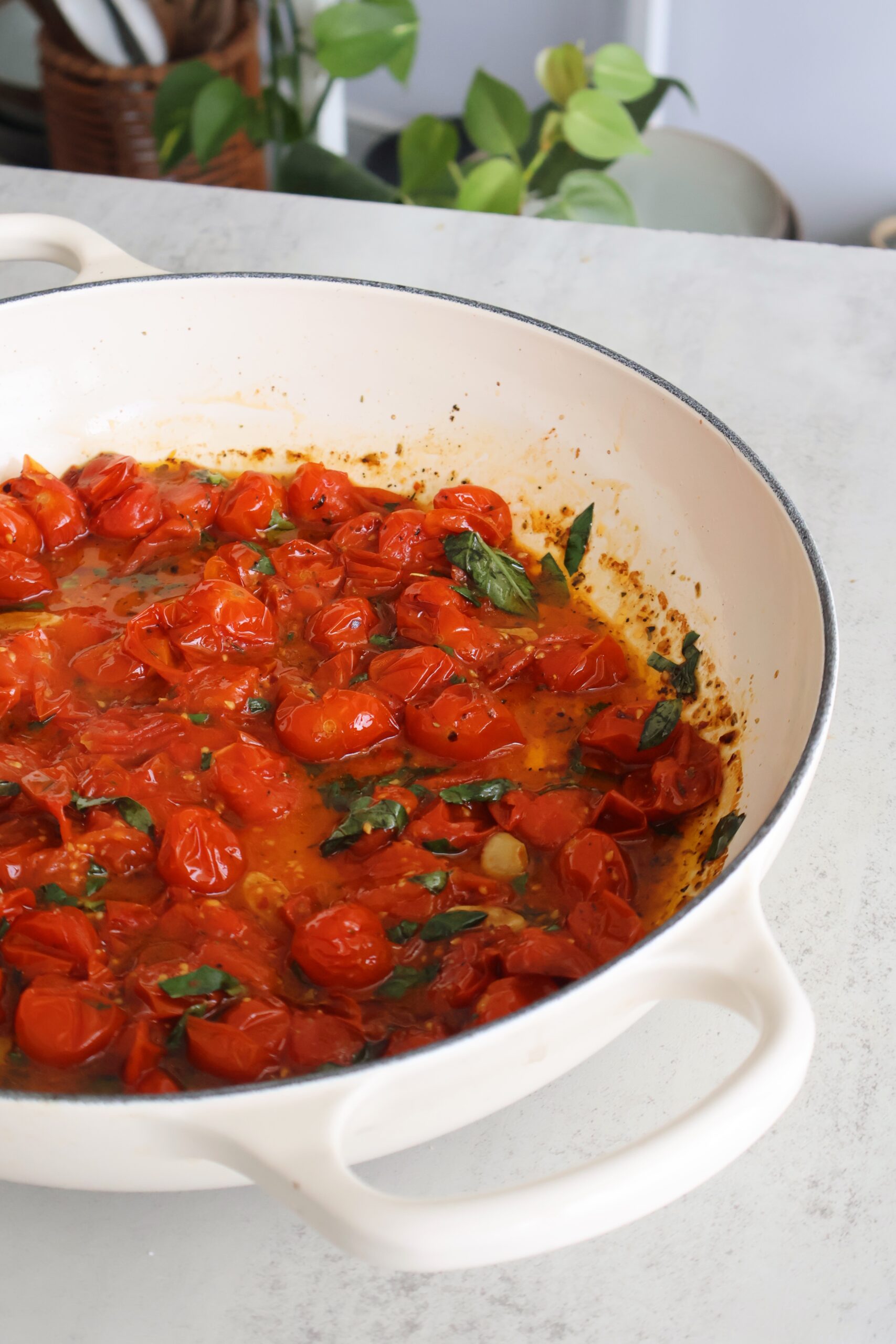 - Add the tomatoes and garlic to a large brasier pan or oven safe dish. Toss with the olive oil and seasoning. Roast in the oven for 35 minutes, until they start to burst and brown slightly