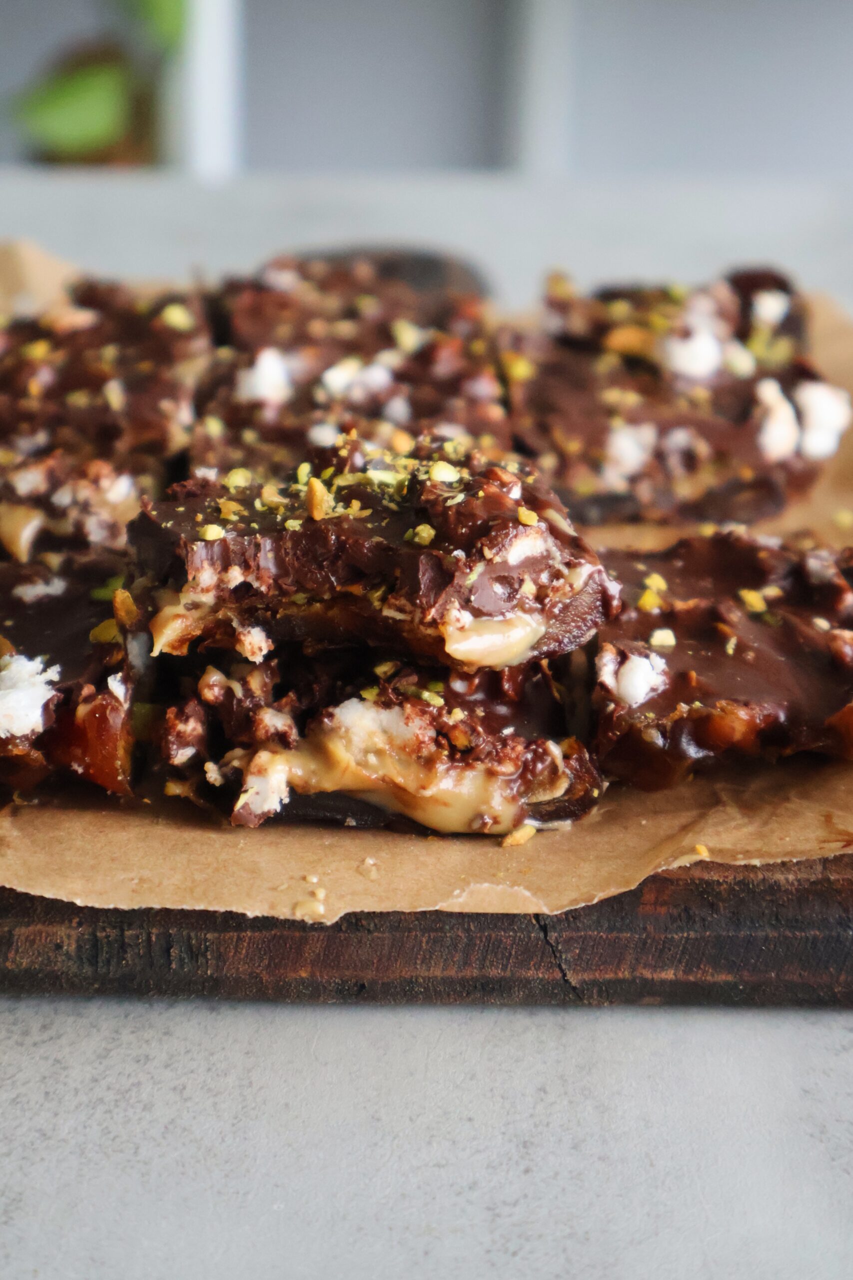 - Melt the chocolate chips with the coconut oil in 30 second increments until smooth. Pour the chocolate over the bars, then top with more chopped pistachios and flakey salt
