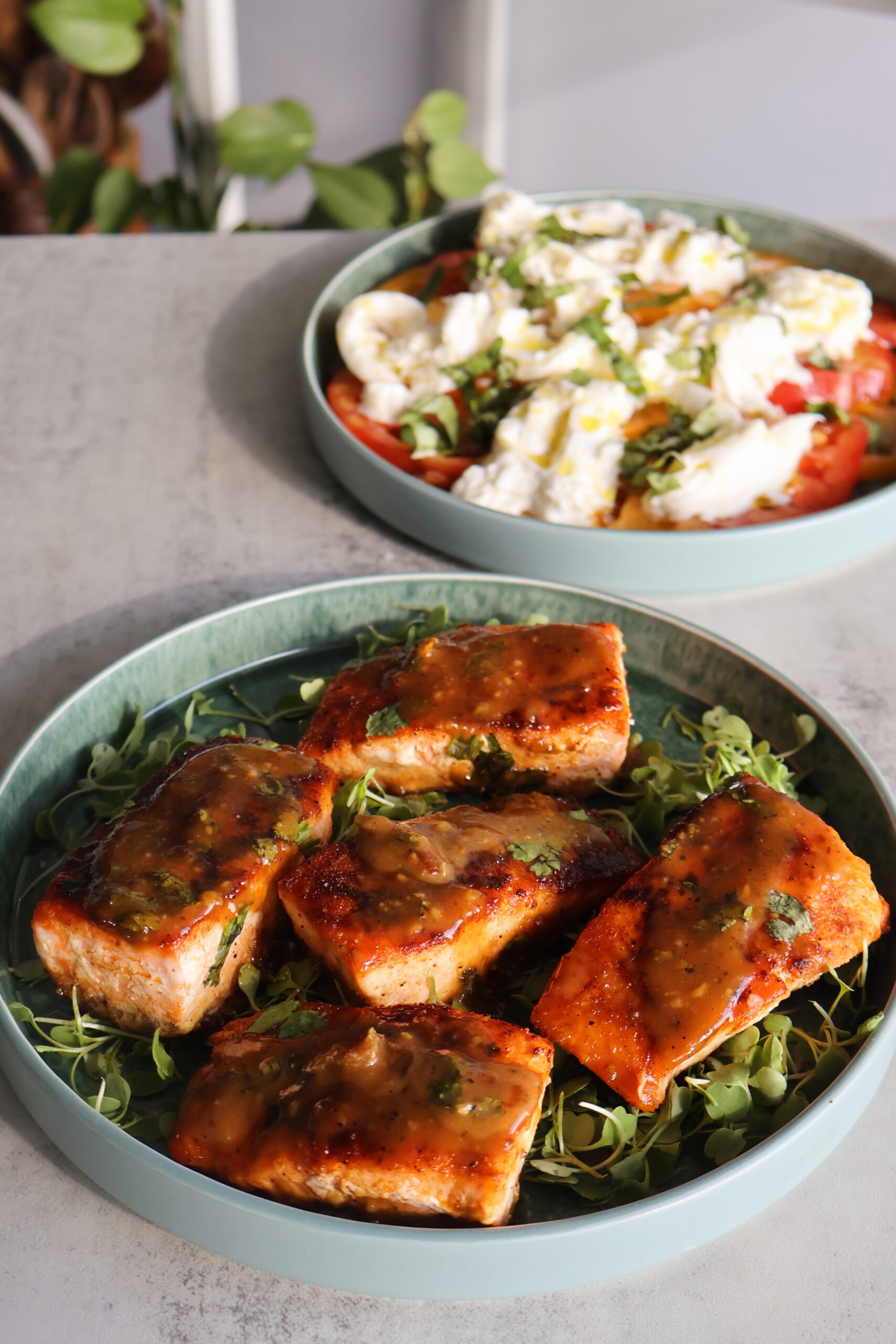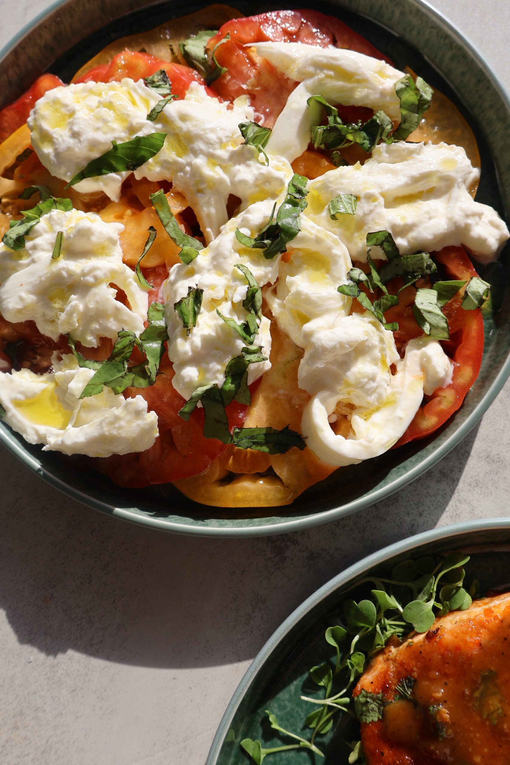 - For the tomato salad, thinly slice the tomatoes and layer them on a plate. Top with flakey salt, a drizzle of olive oil, burrata and fresh basil.