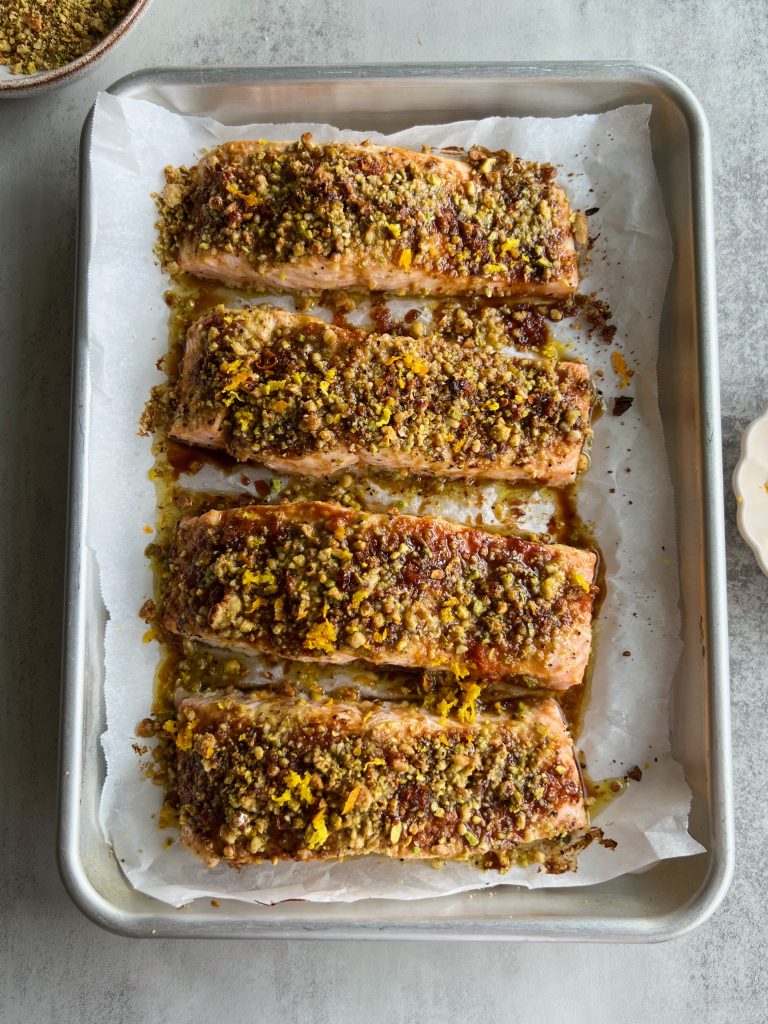 This walnut and pistachio crusted salmon with citrus date glaze is one of my favorite dinners. Salmon fillets are brushed with dijon mustard and lightly seasoned with salt, pepper and garlic powder, then topped with crushed nuts, date syrup and orange zest.