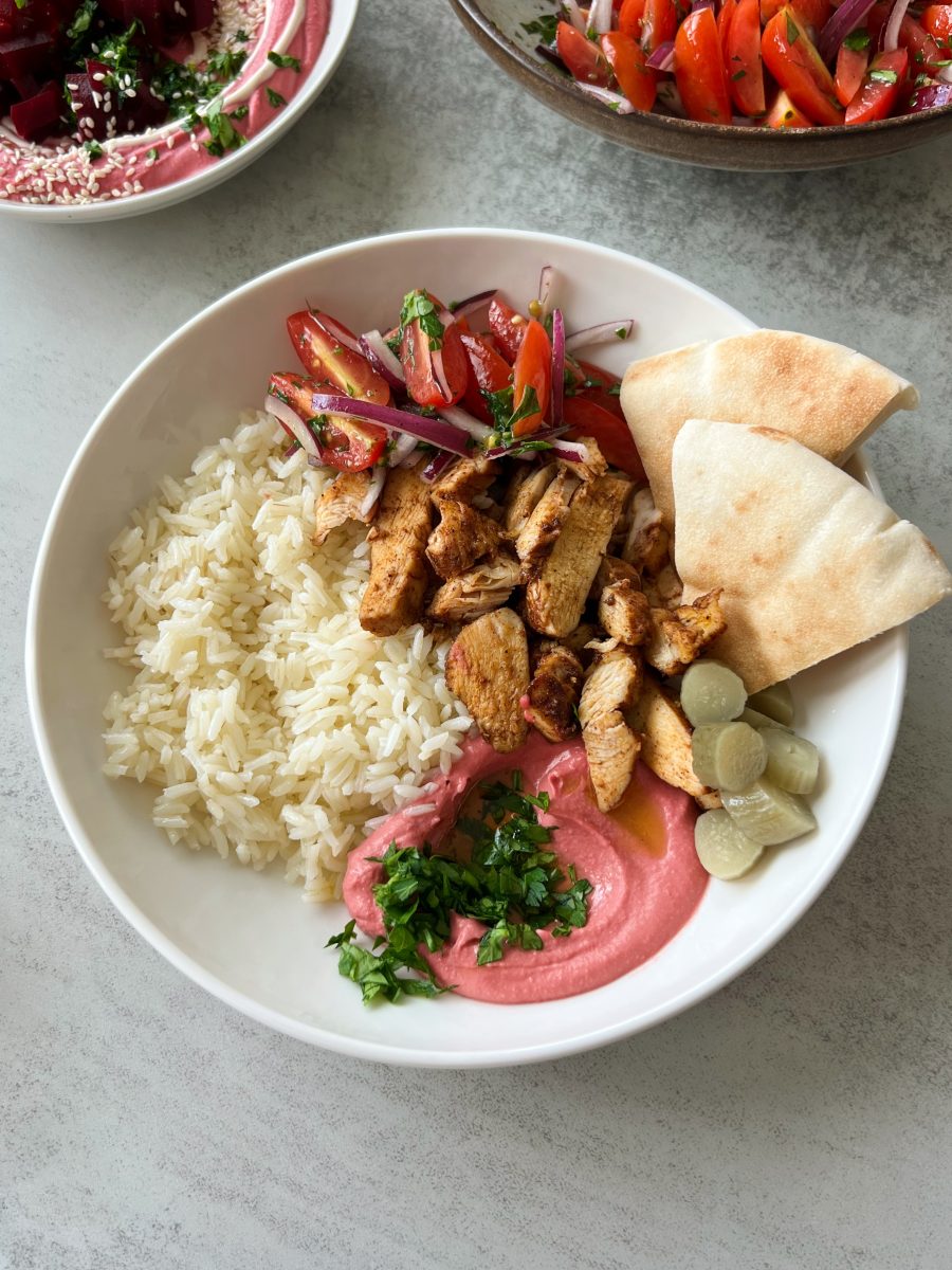 While the chicken bakes, blend together the beet hummus and chop the tomato onion salad. Prepare your rice and warm some pita bread.