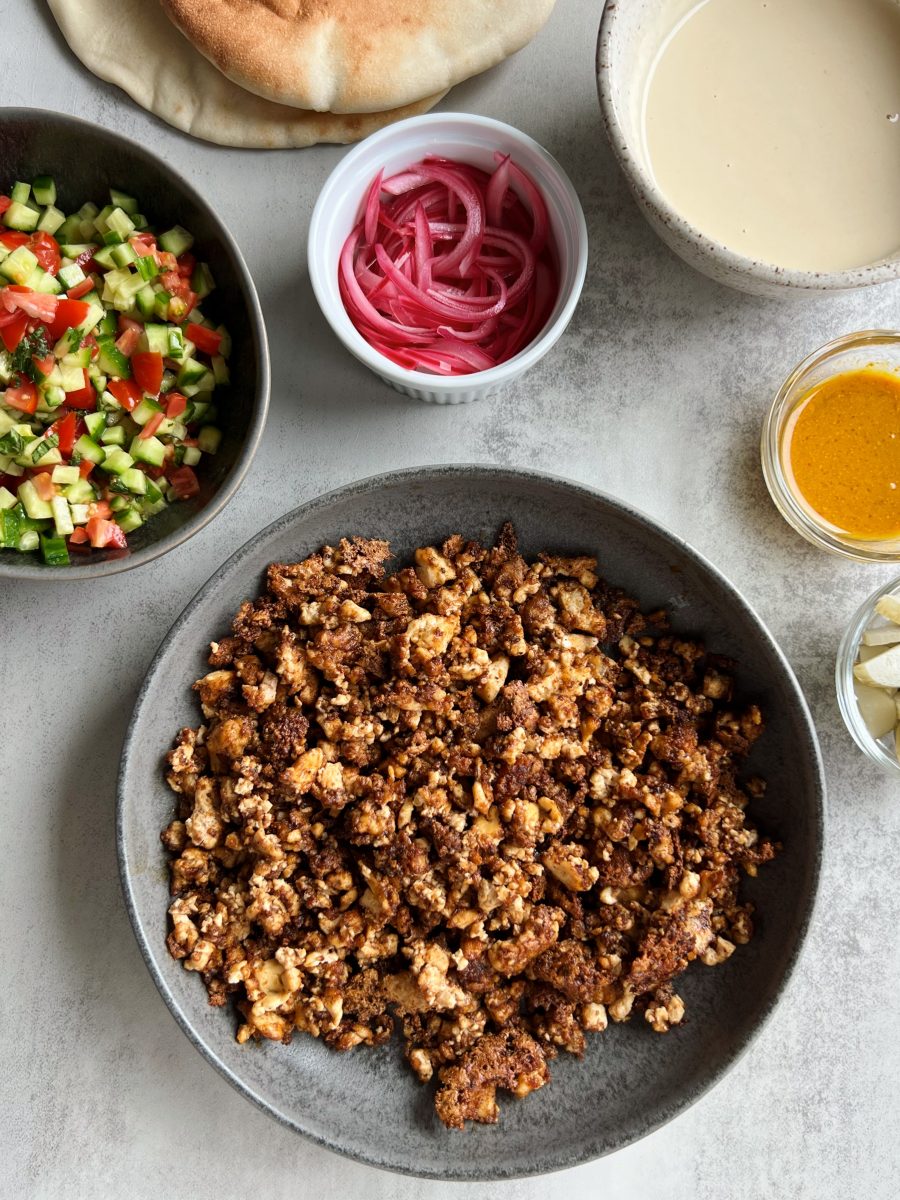 For this recipe, I crumbled the tofu into a bowl and tossed it with some olive oil, tapioca flour and a variety of spices to give it the perfect flavor. If you have a pre-bought shawarma spice around, you can easily use that in place of all of the spices.