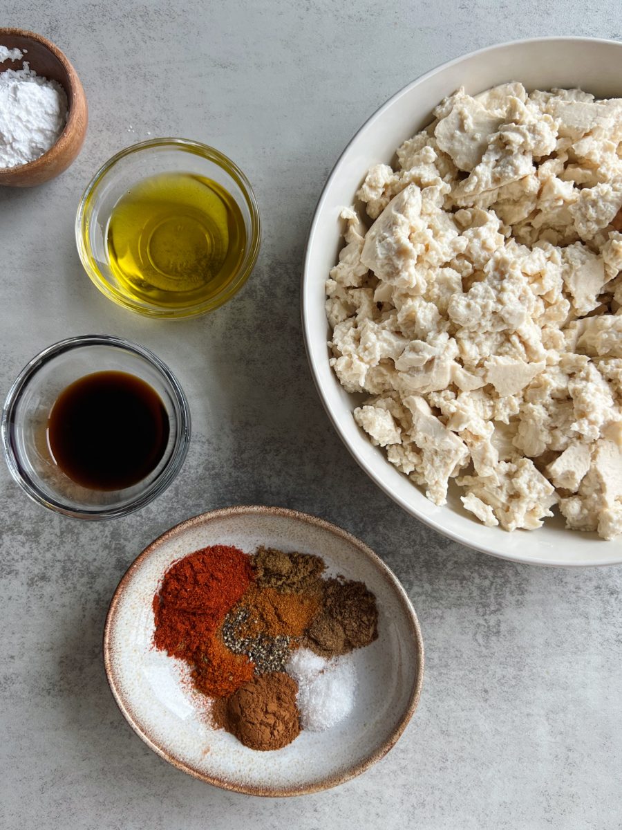 - Drain the tofu and pat it dry with a dish rag. Crumble it into a bowl and toss it with the tapioca flour, olive oil and all of the listed spices.
