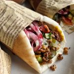 - Once the tofu is ready, assemble your wraps. Slice open your pita in half and spread amba across the middle. Layer with the tofu crumbles, chopped salad, pickled onions, pickles, and a drizzle of tahini. Fold the pita over the center and hold together using parchment or foil. Alternatively, you can cut open the top of the pita and fill the pita with all of the fillings. Drizzle with extra tahini sauce when serving.