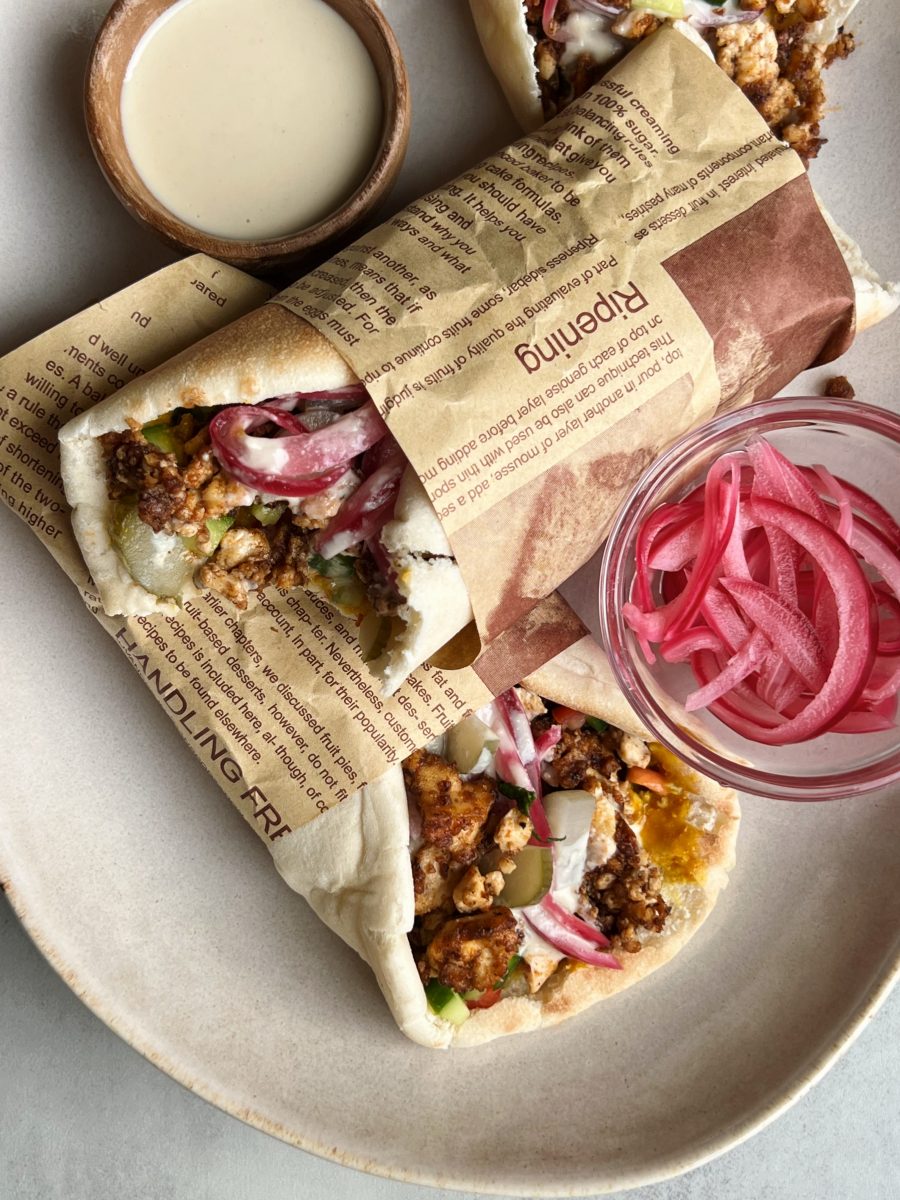 The tofu is seasoned with a handful of warm, flavorful spices like smoked paprika, cinnamon, cayenne and allspice then baked until golden brown. It’s then assemble in a pita with all the fix-ins!